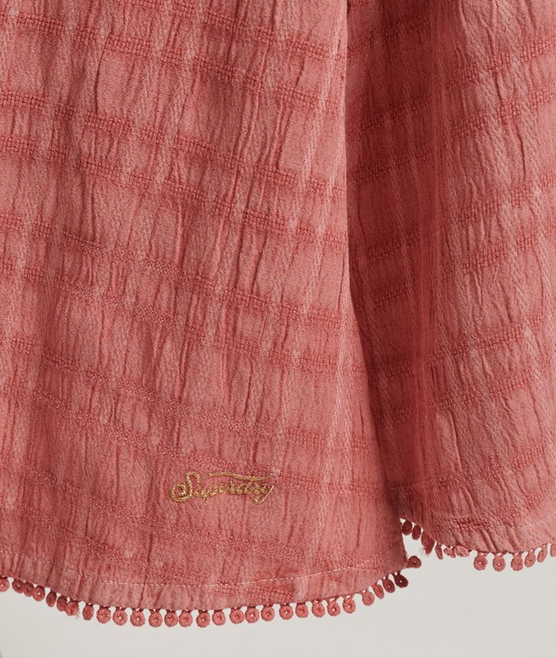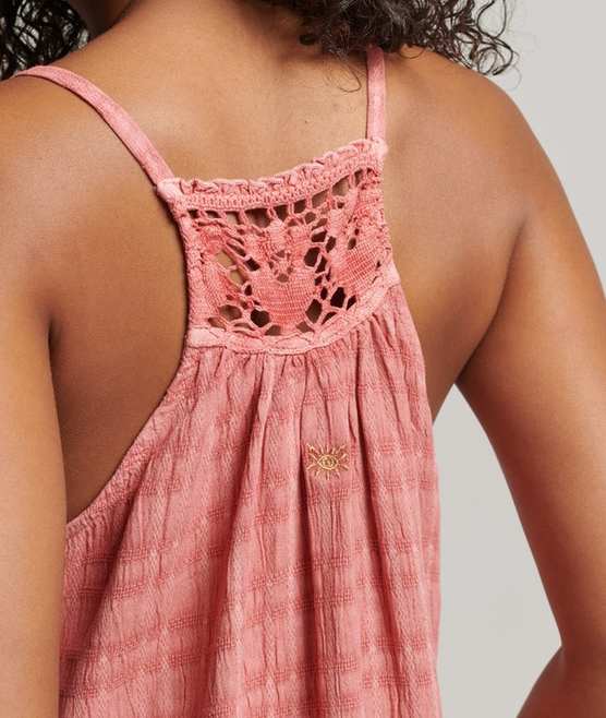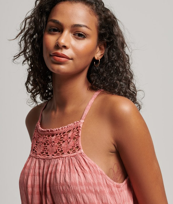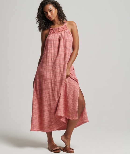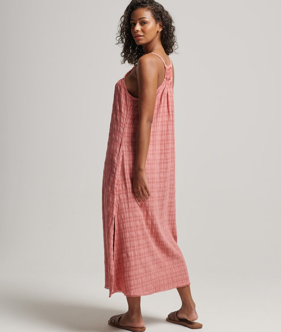 Vestido ROSA cuello halter Bolsillos laterales MARCA: Super Dry ORIGEN: India COMPOSICIÓN: lino 4%, viscosa 59%, algodón 37% MEDIDAS: contorno SISA / CADERA / LARGO 8-36: 100cm / 126cm / 110cm 10-38: 110cm / 130cm / 115cm 14-42: 120cm / 150cm / 120cm