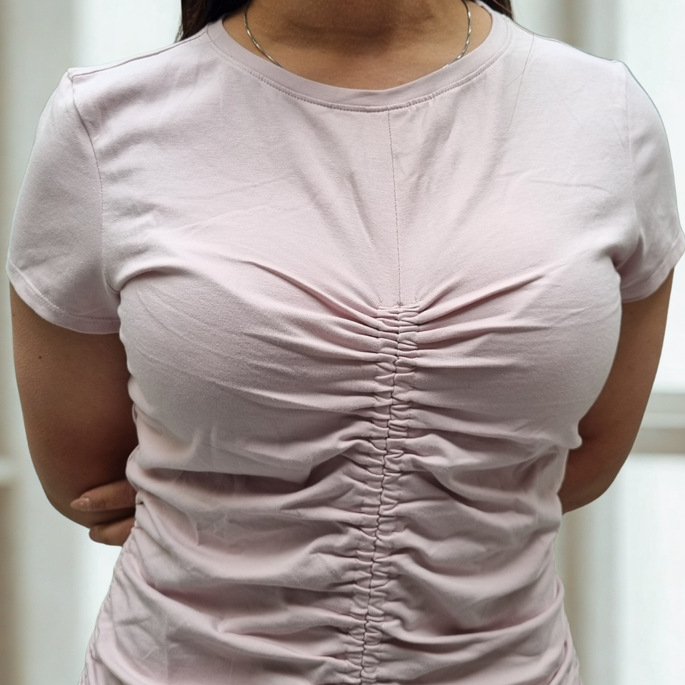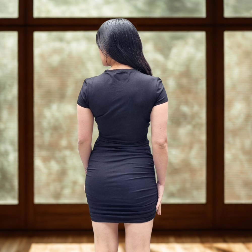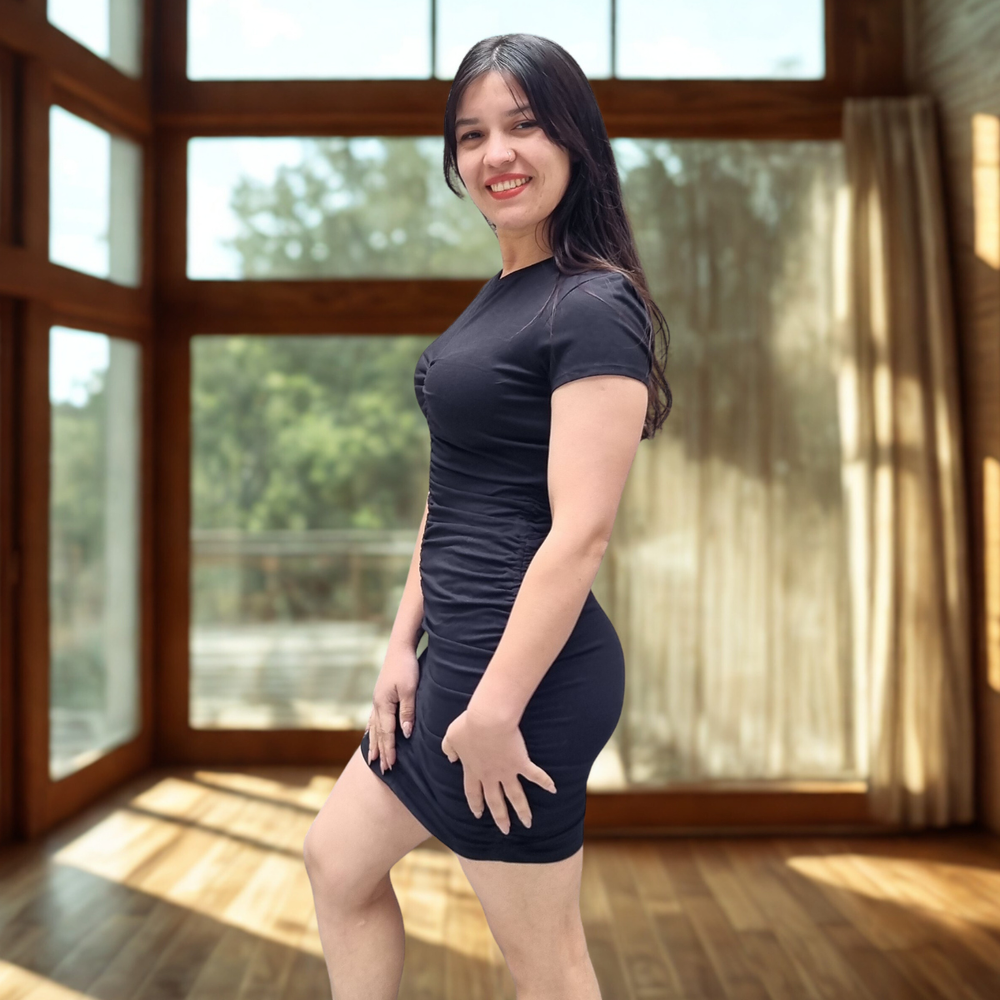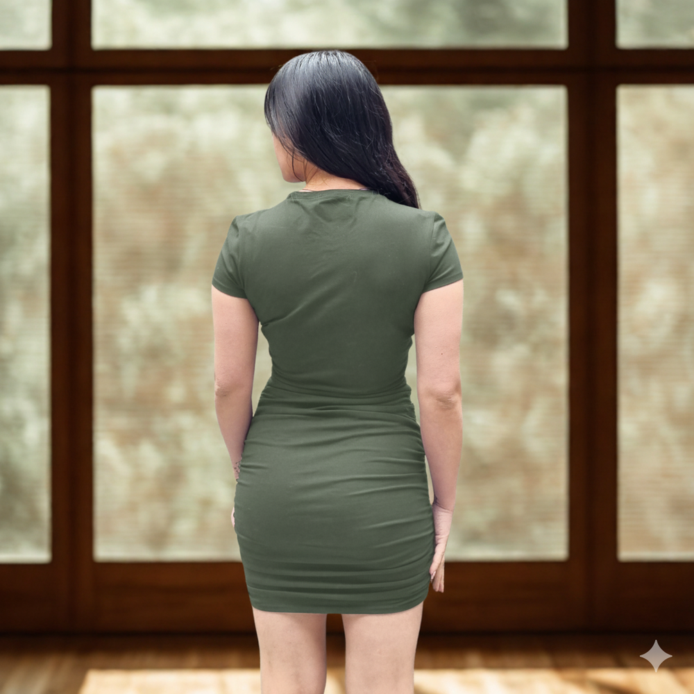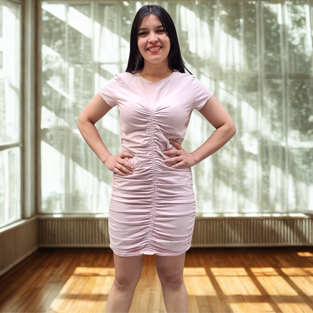 VESTIDO CORTO CON FRUNCE MANGA CORTA ELASTIZADO MARCA: Anaandi ORIGEN: India COMPOSICIÓN: Algodón 97% - Spandex 3%