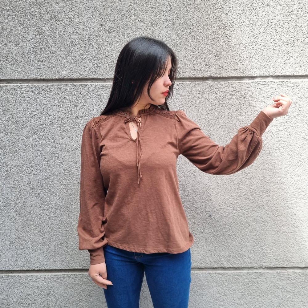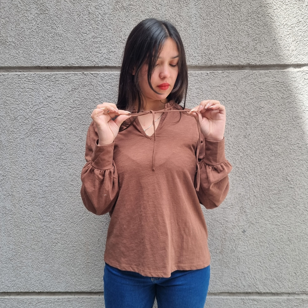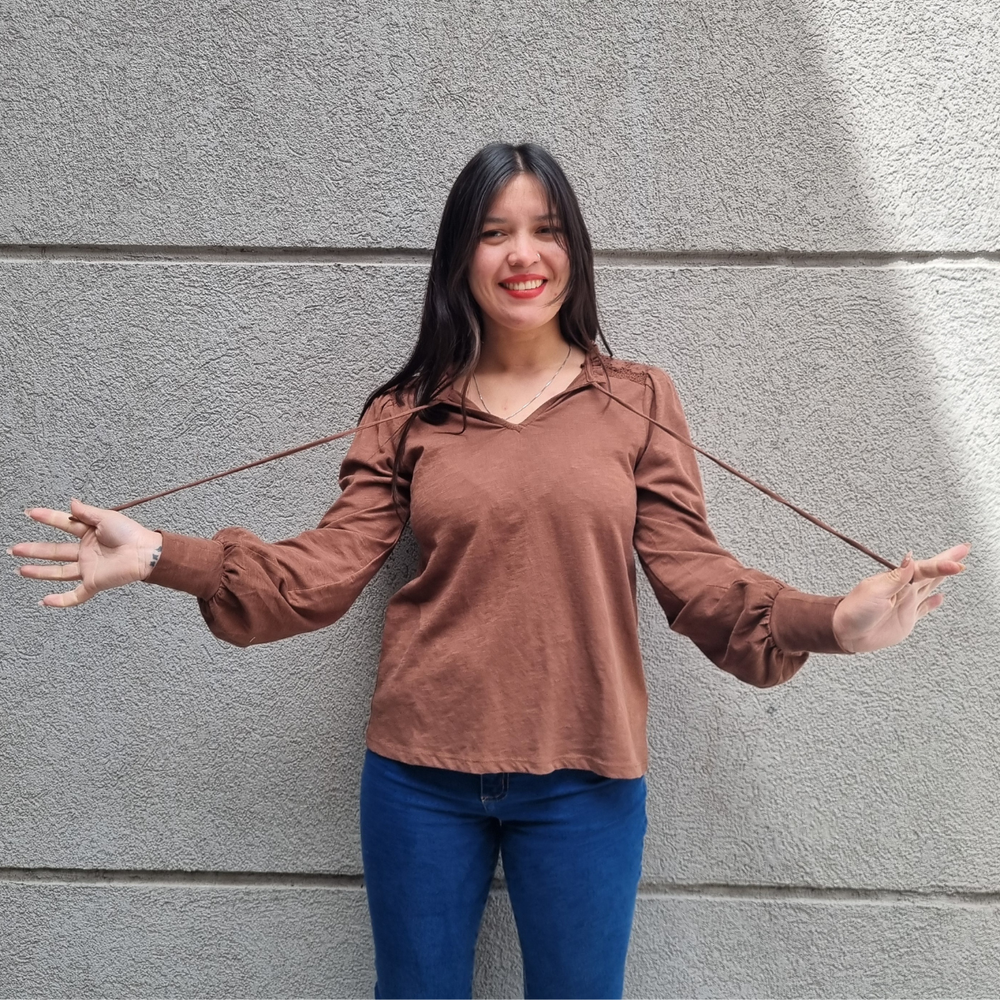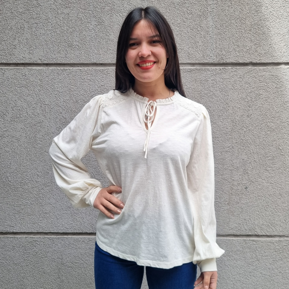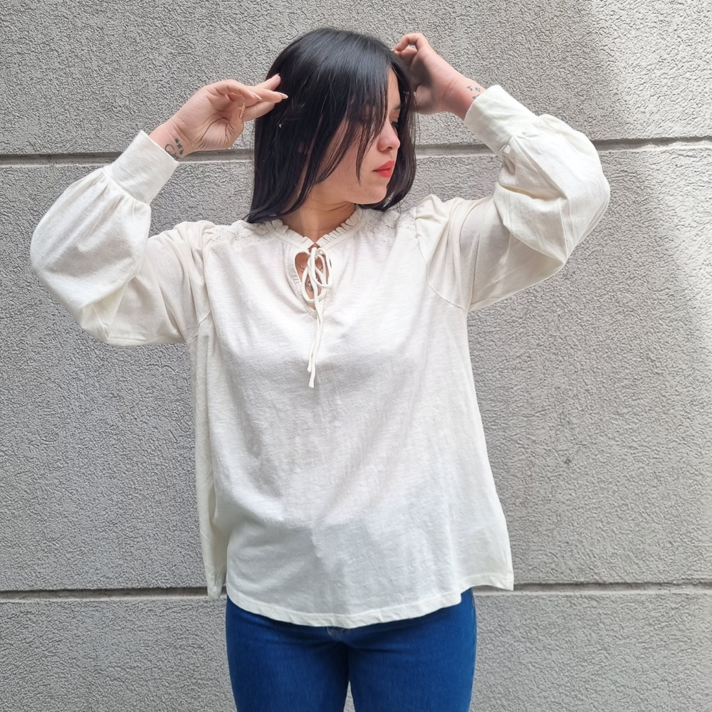 BLUSA MANGA LARGA CON MANGA PRINCESA Y CORDONES EN EL CUELLO MARCA: Jennie Garth ORIGEN: India COMPOSICIÓN: Algodón 67% - Poliéster 33%