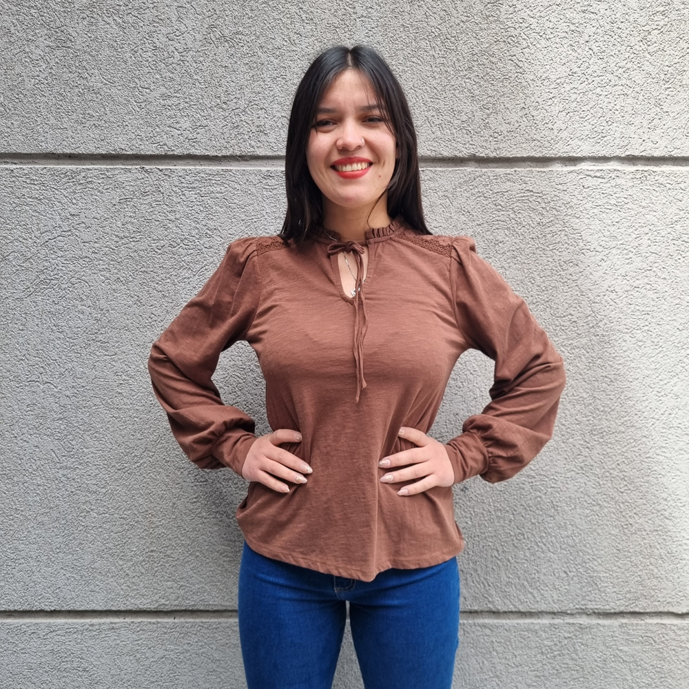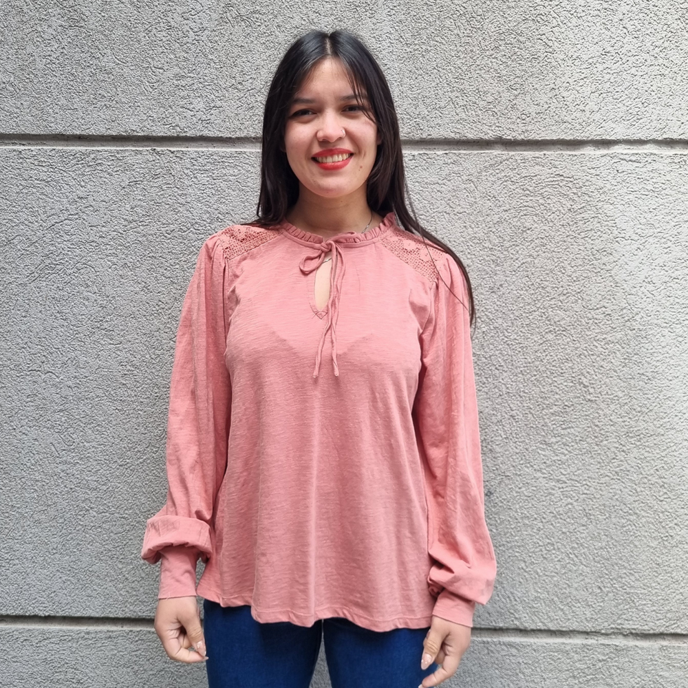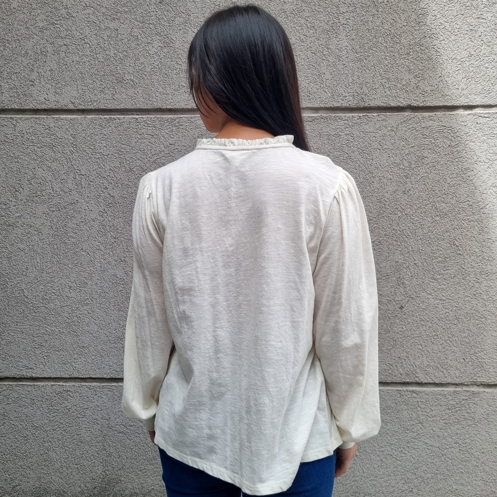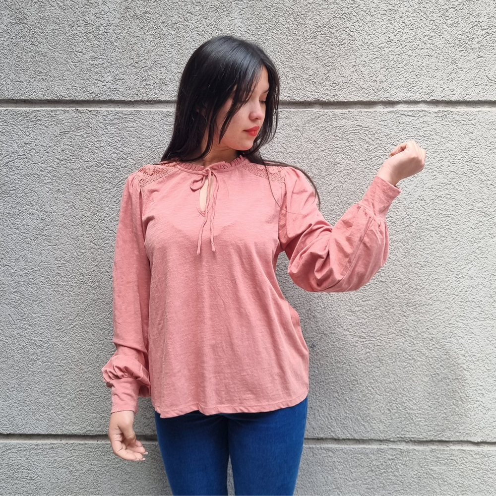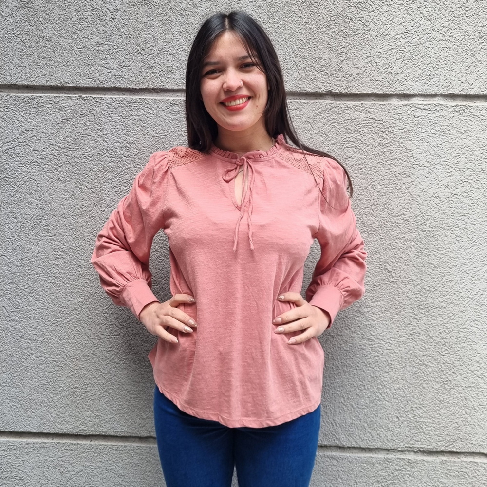 BLUSA MANGA LARGA CON MANGA PRINCESA Y CORDONES EN EL CUELLO MARCA: Jennie Garth ORIGEN: India COMPOSICIÓN: Algodón 67% - Poliéster 33%