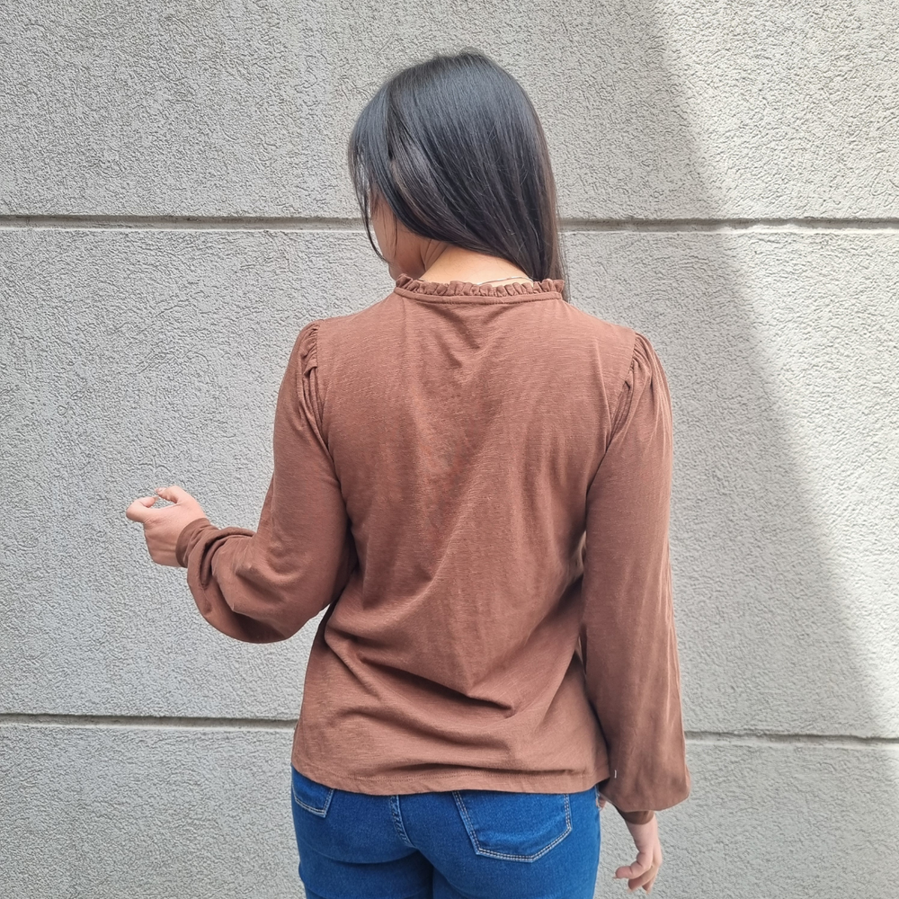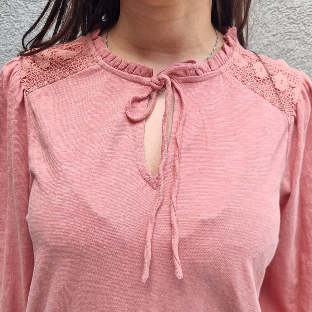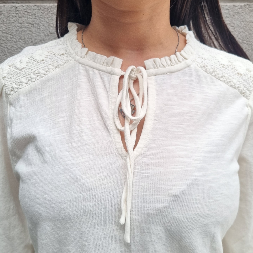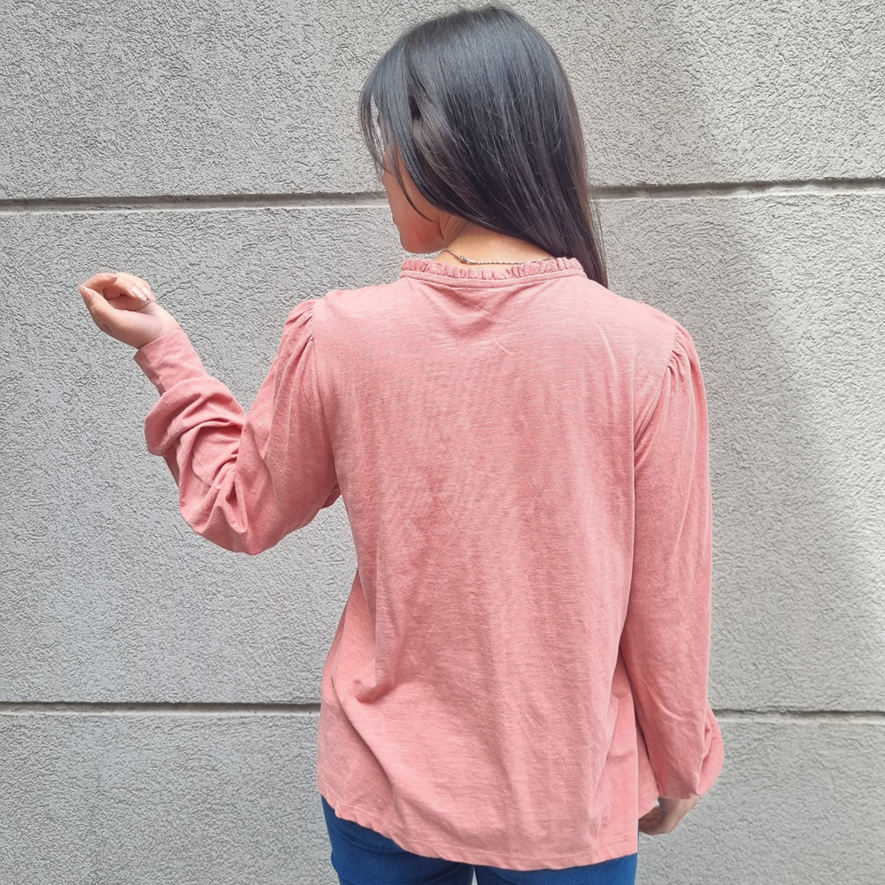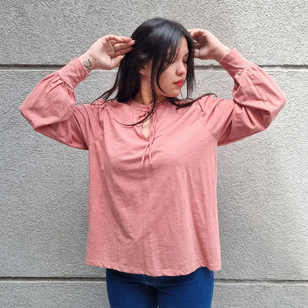 BLUSA MANGA LARGA CON MANGA PRINCESA Y CORDONES EN EL CUELLO MARCA: Jennie Garth ORIGEN: India COMPOSICIÓN: Algodón 67% - Poliéster 33%