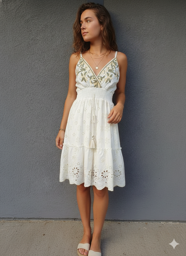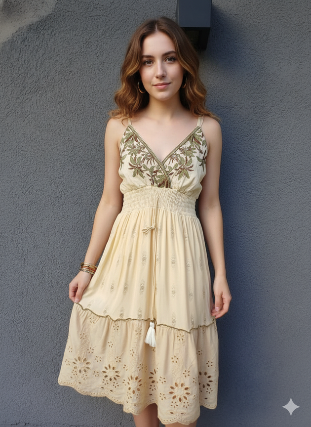 Vestidos Boutique corto bordado a mano con breteles regulables. Forro interno MARCA: Anaandi TELA: 100% Algodón Origen: India.