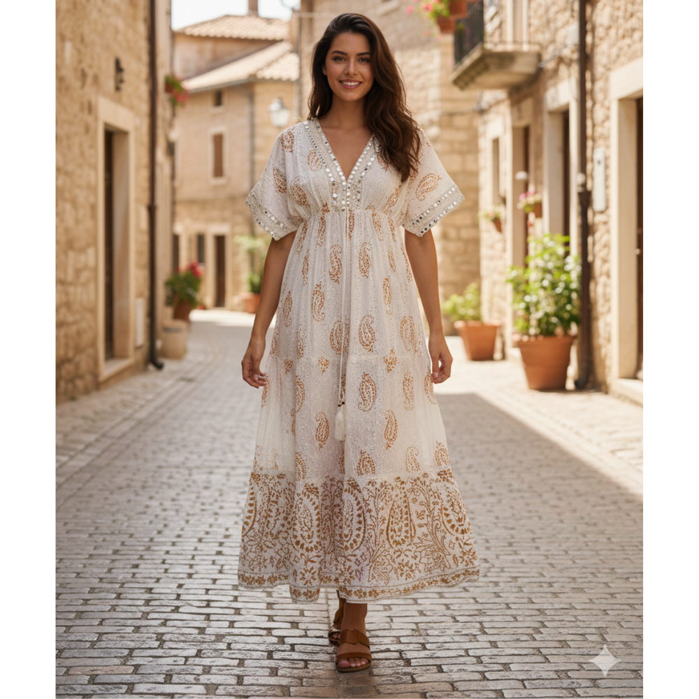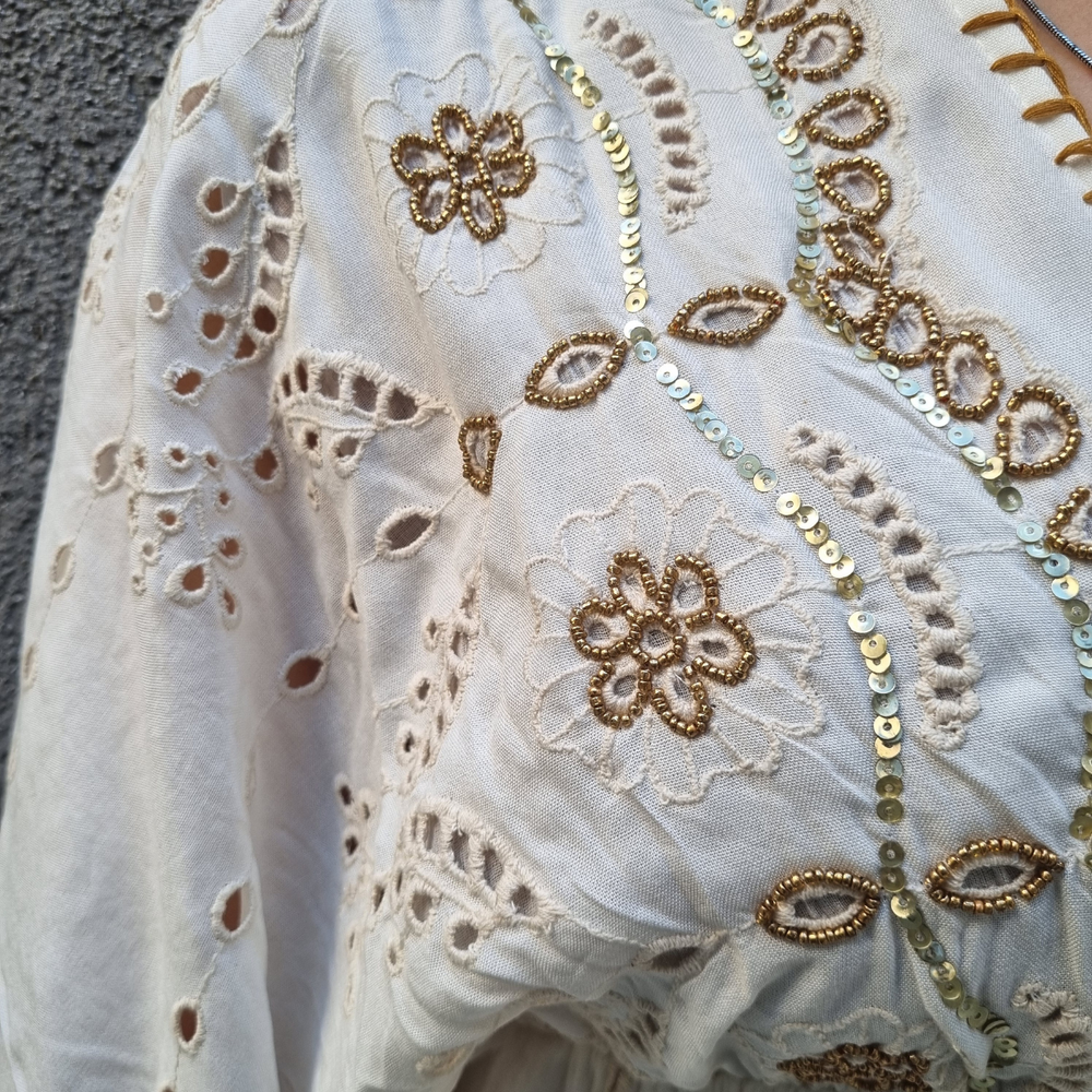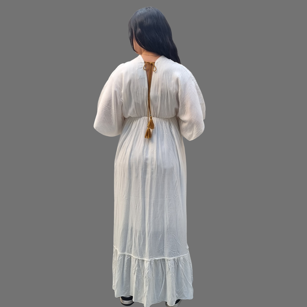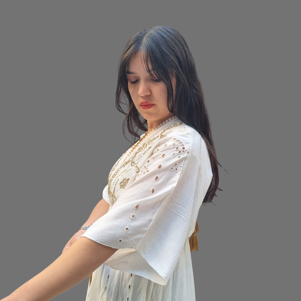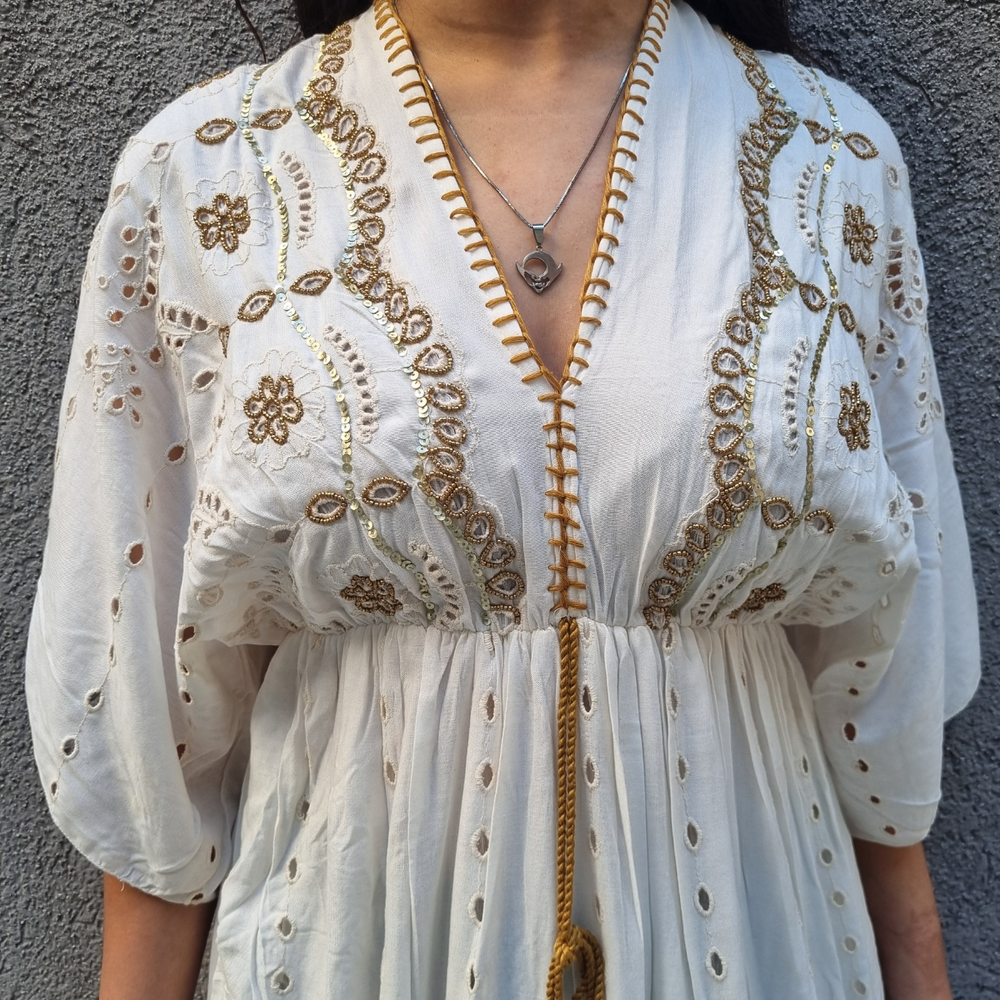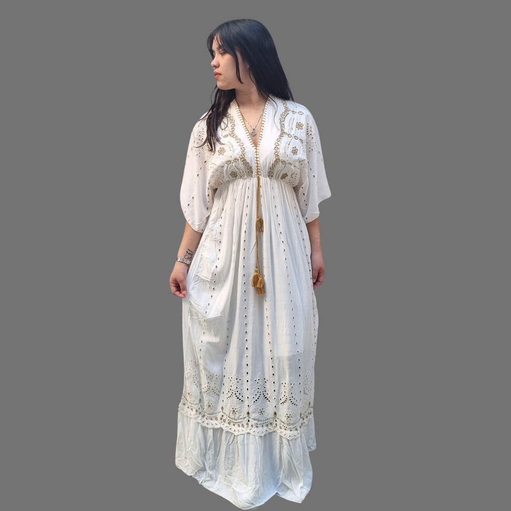 VESTIDO LARGO BORDADO BRODERIE MANGA CORTA MARCA: Anaandi ORIGEN: India COMPOSICIÓN: Viscosa 100%