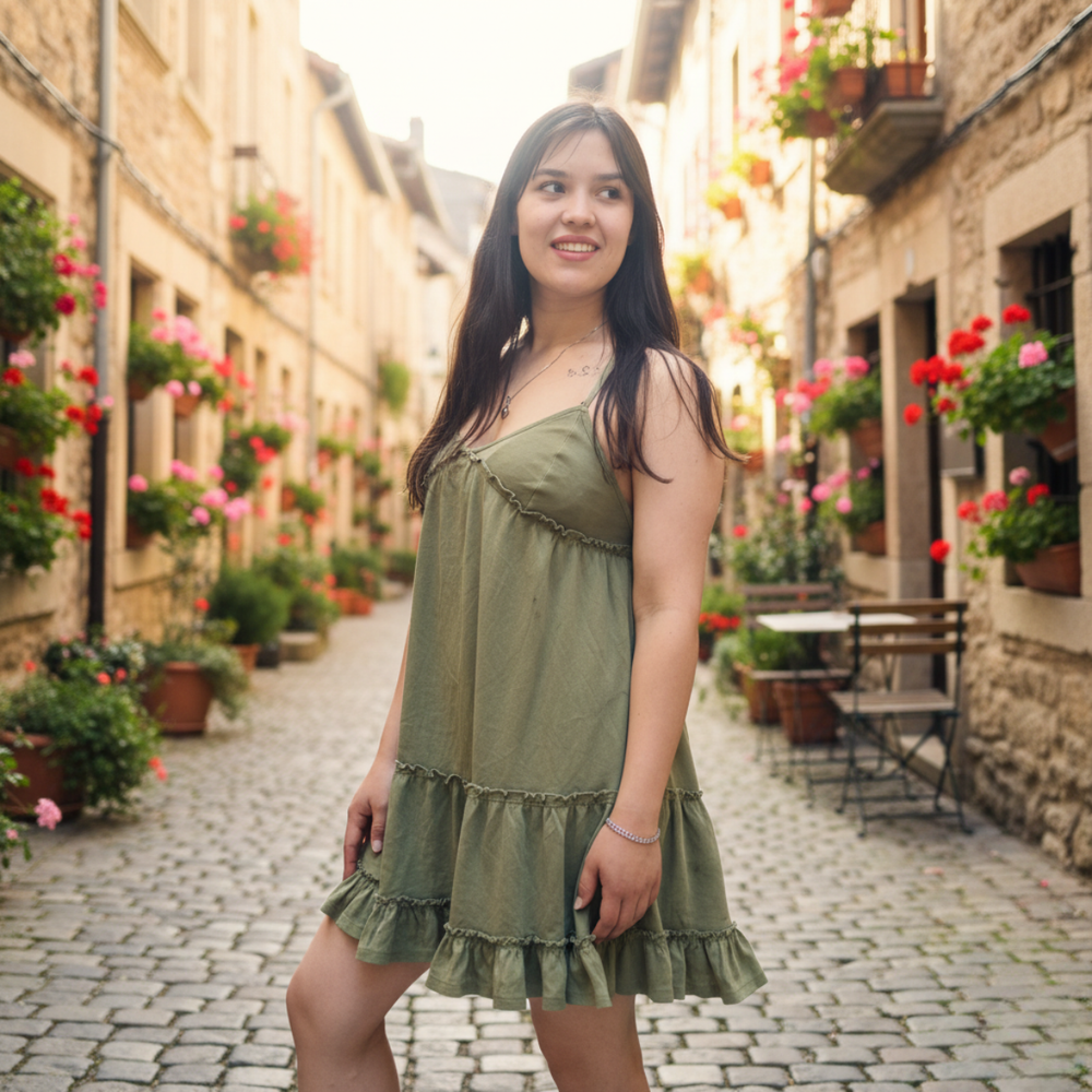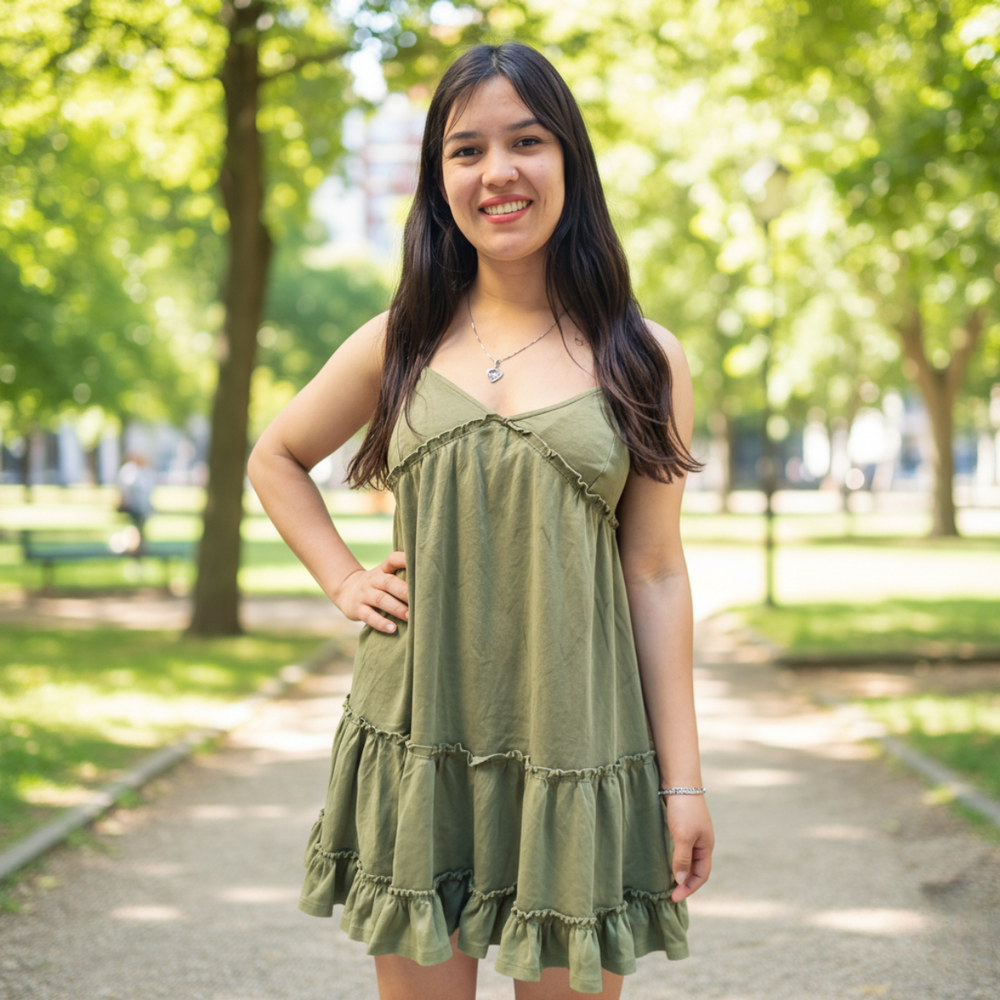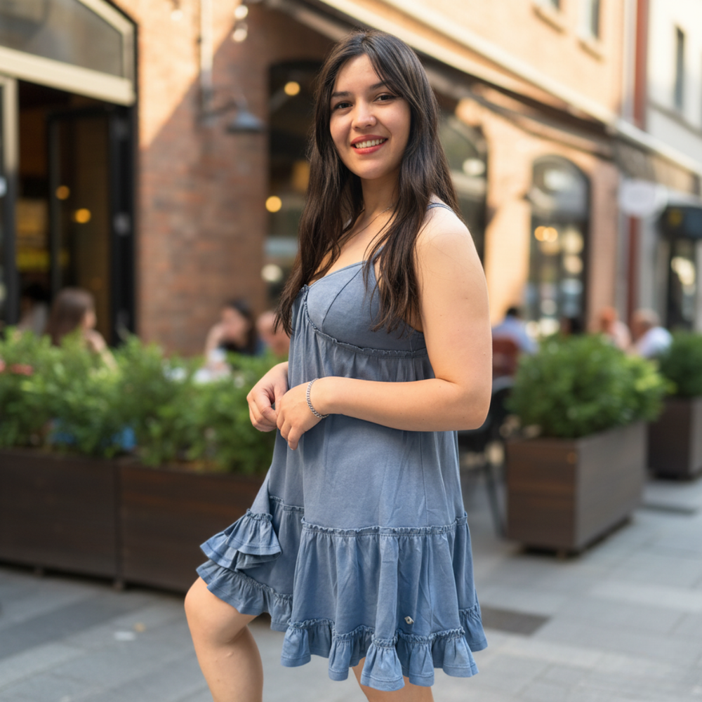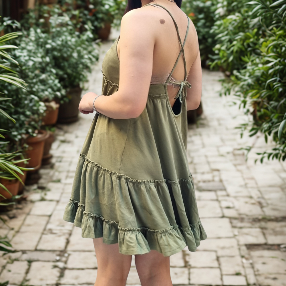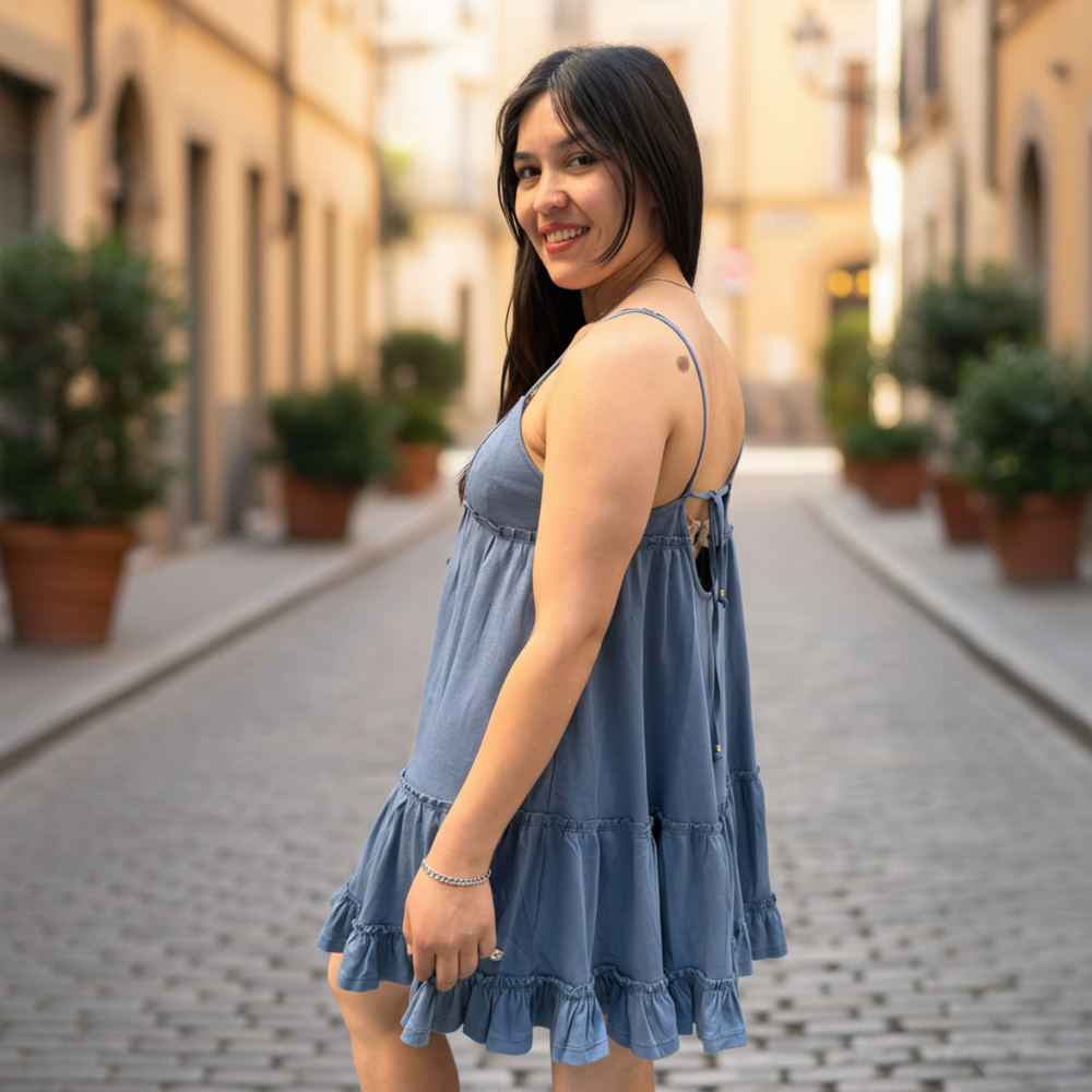 VESTIDO CORTO CON BRETELES REGULABLES Y VOLADOS MARCA: Super Dry ORIGEN: India COMPOSICIÓN: Algodón 100%