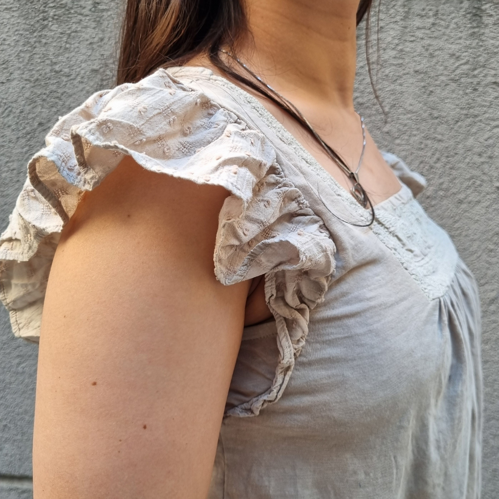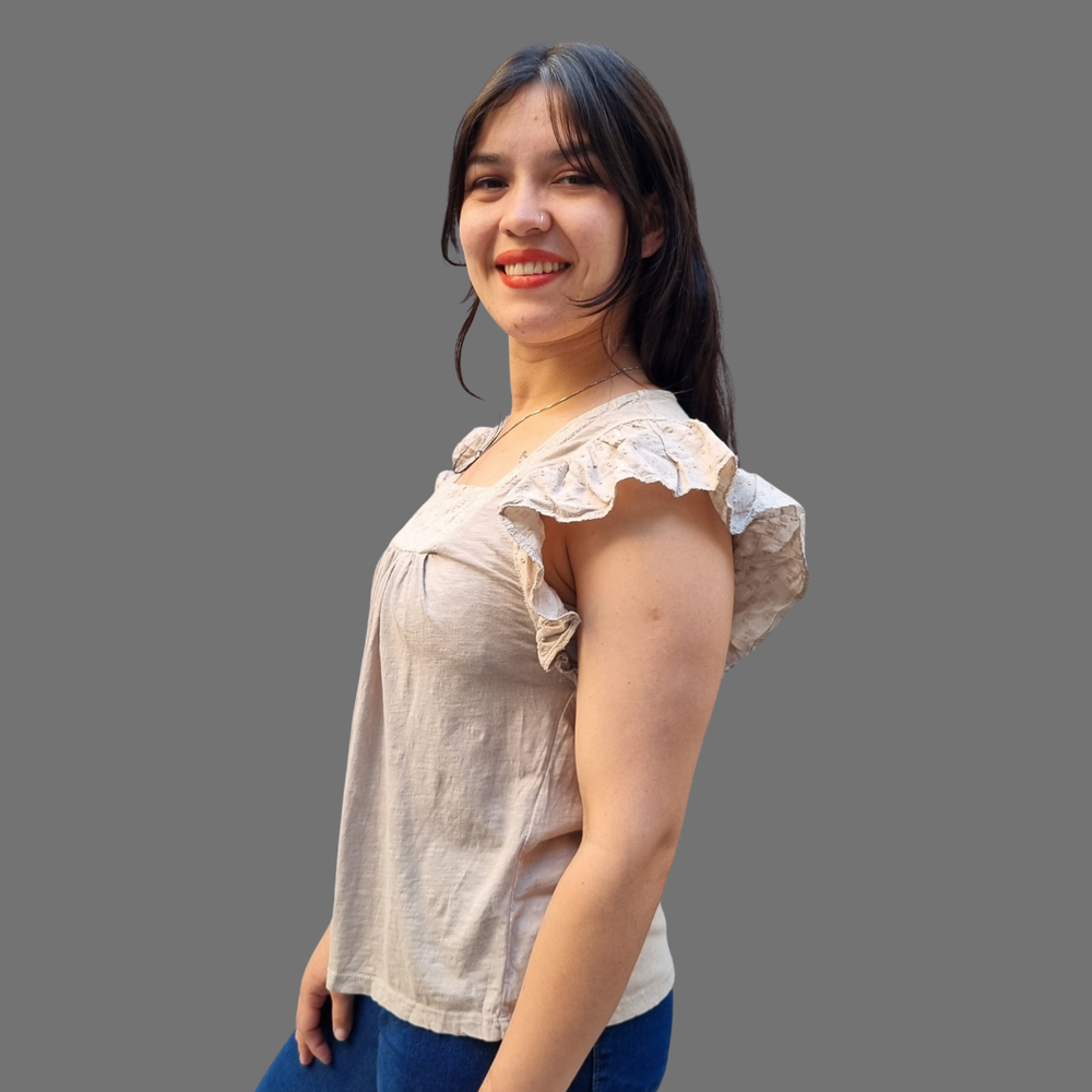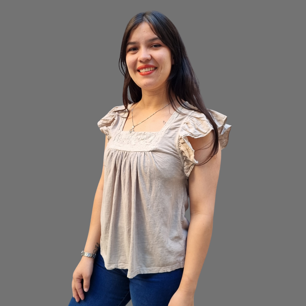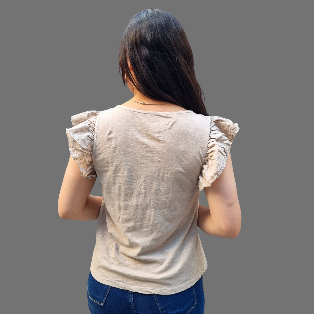 BLUSA MANGA CORTA VOLADO CUELLO CUADRADO MARCA: Lucky Brand ORIGEN: India COMPOSICIÓN: 100% Algodón