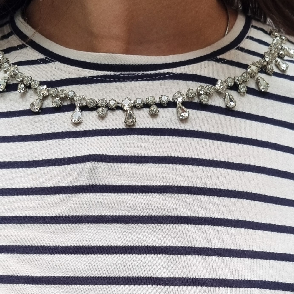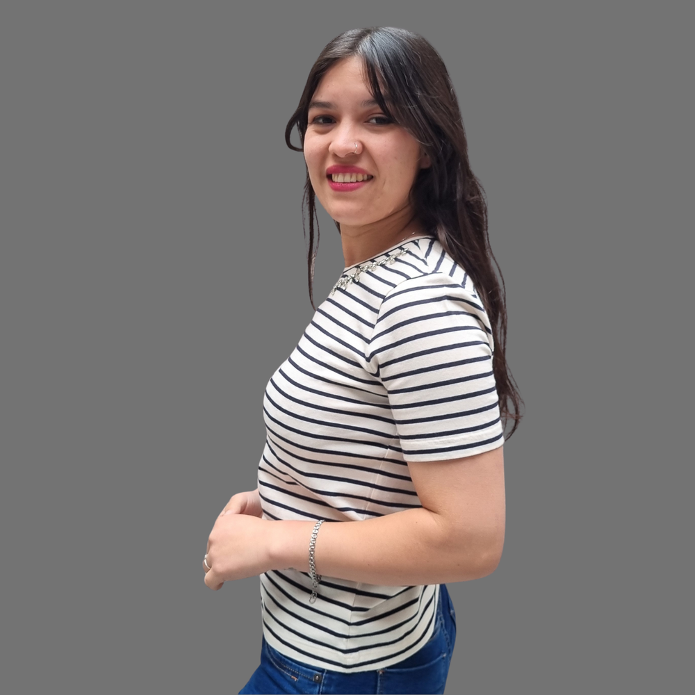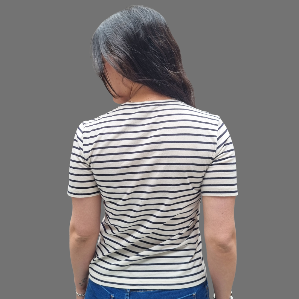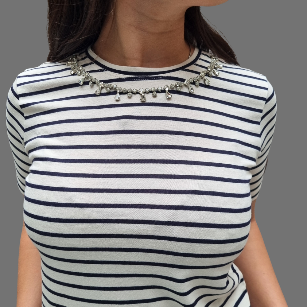 REMERA RAYADA MANGA CORTA CUELLO REDONDO CON DETALLE DE PEDRERIA MARCA: Next ORIGEN: India COMPOSICIÓN: Algodón 100%