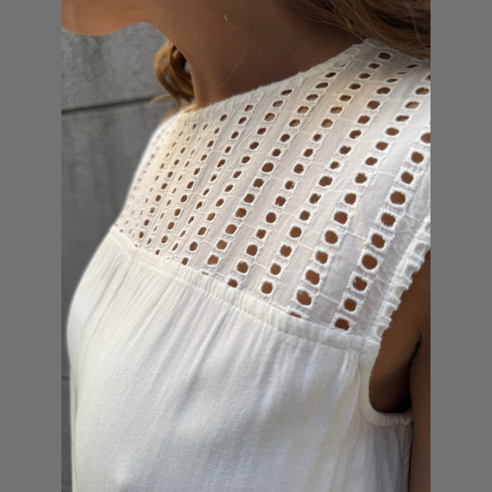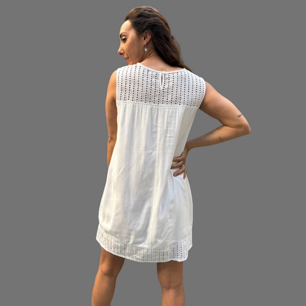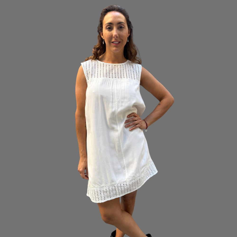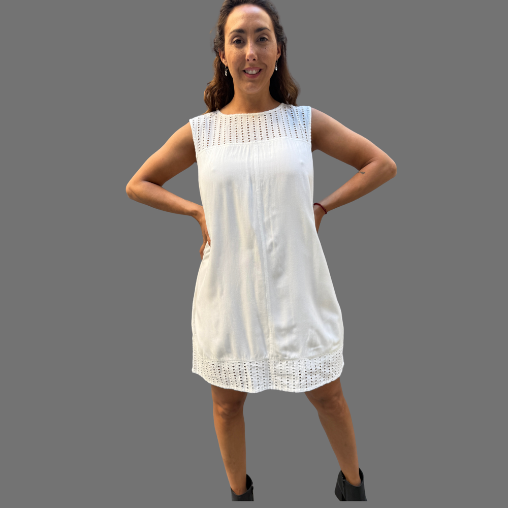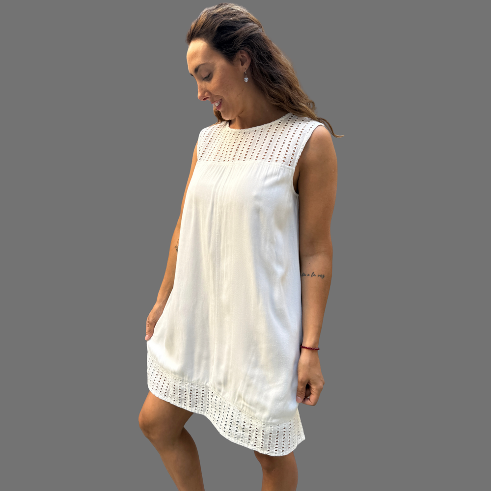 VESTIDO CORTO SM DETALLE CALADO EN HOMBRO Y FALDA. Con FORRO INTERNO MARCA: Woman ORIGEN: India COMPOSICIÓN: Algodón 100%