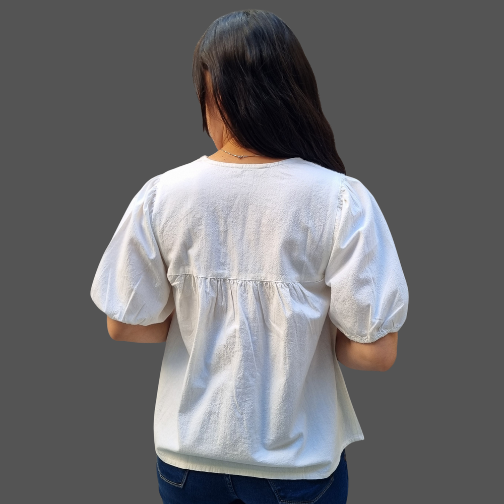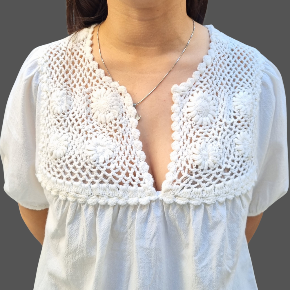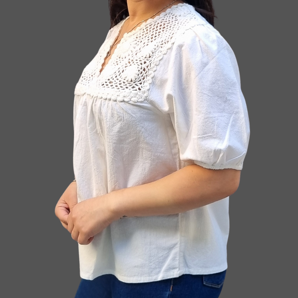 BLUSA CUELLO V PECHERA CROCHET MANGA CORTA TIPO PRINCESA MARCA: Lucky Brand ORIGEN: India COMPOSICIÓN: Algodón 100%