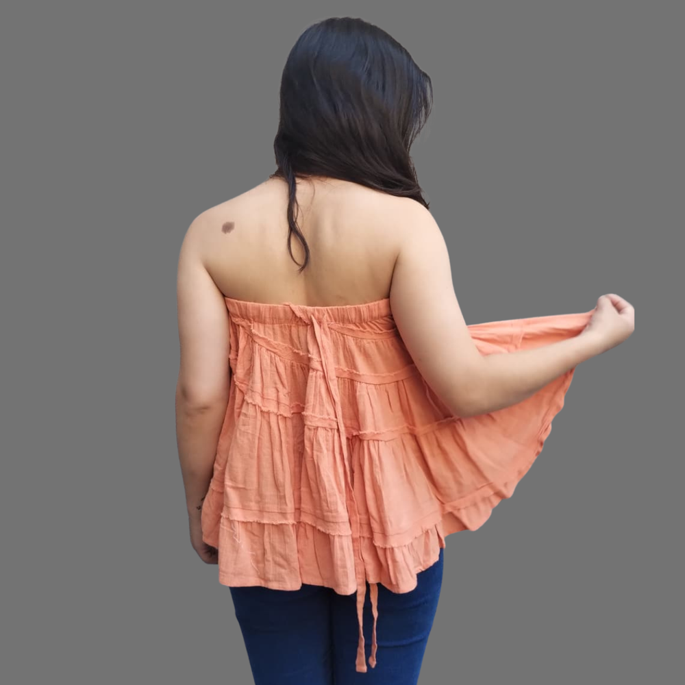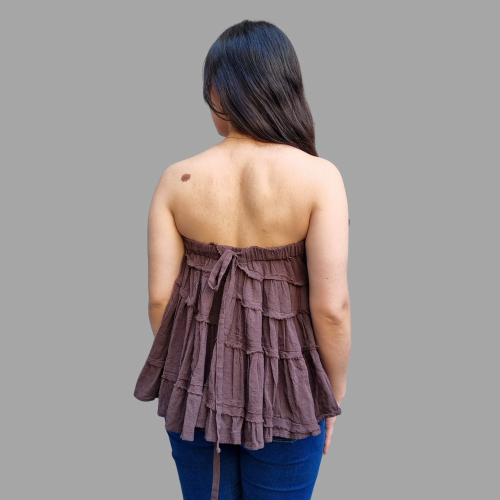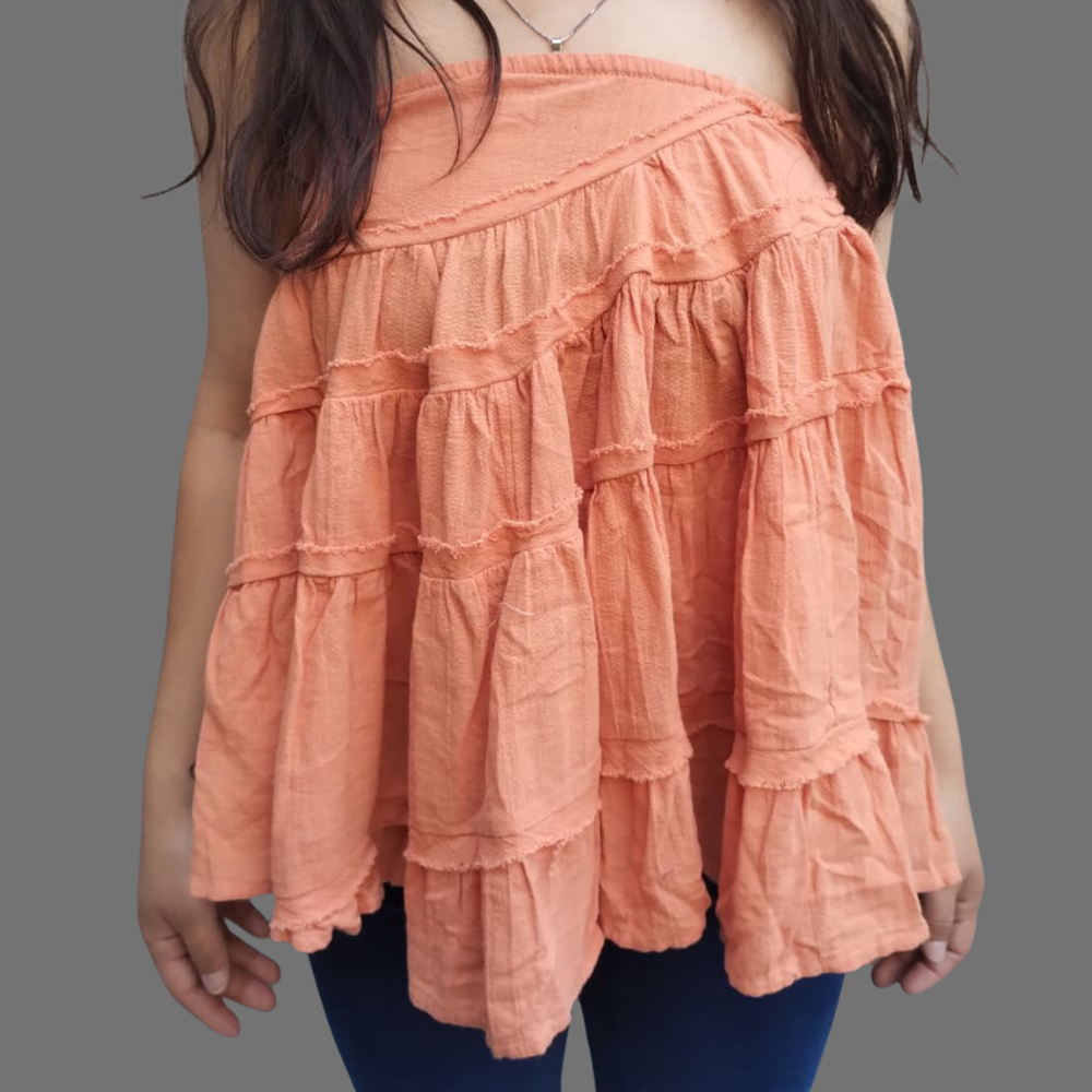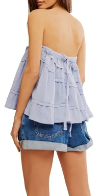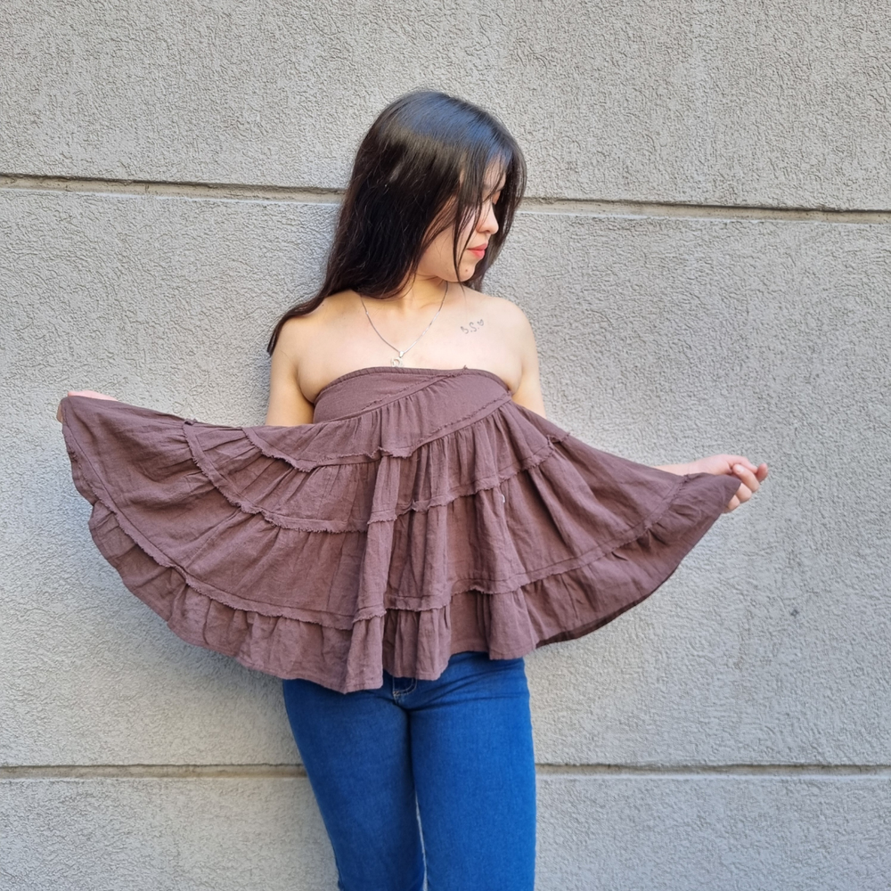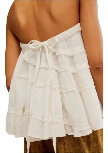Este versátil modelo de Free People se puede usar como top sin tirantes o como falda ajustando el cordón. Presenta costuras expuestas y volantes escalonados.