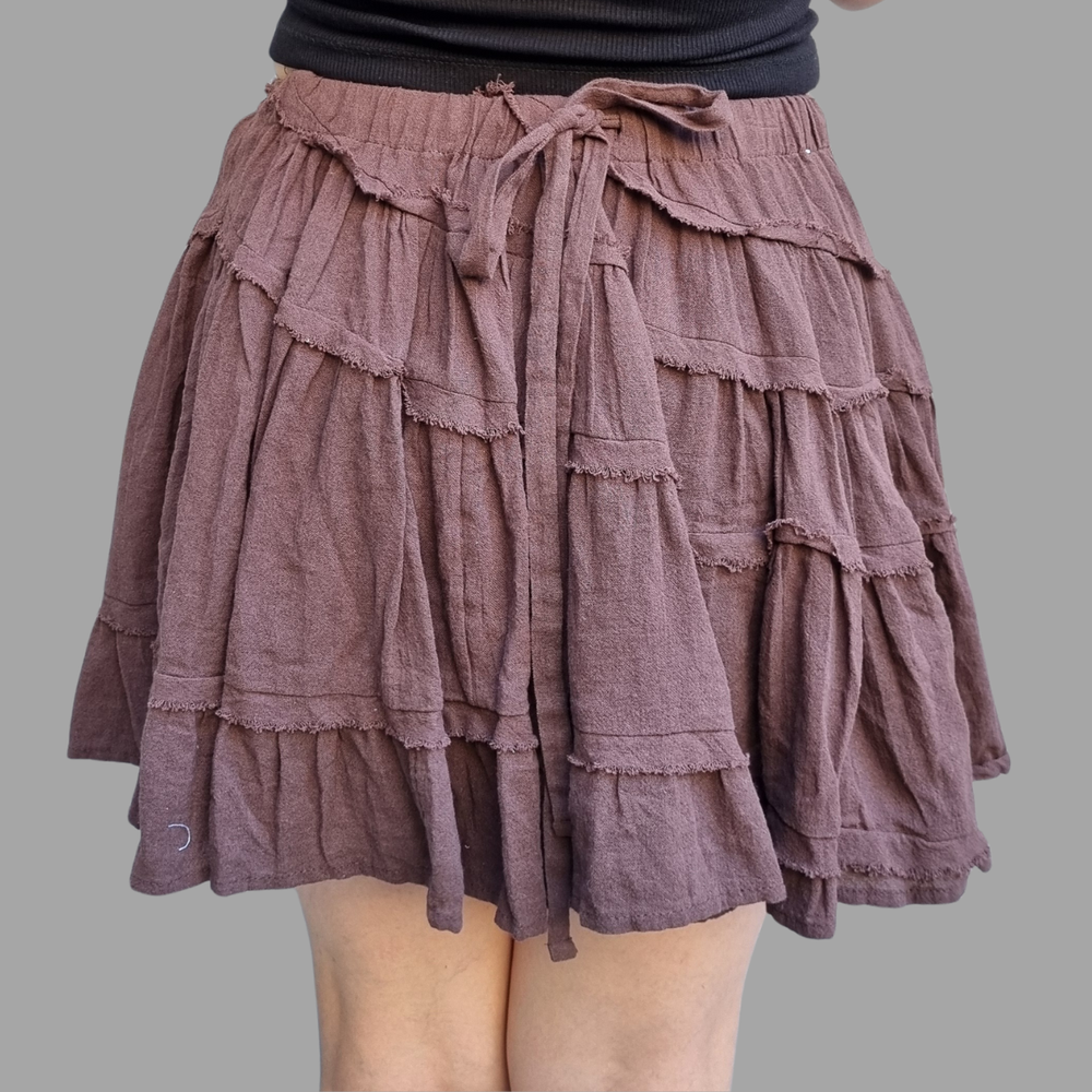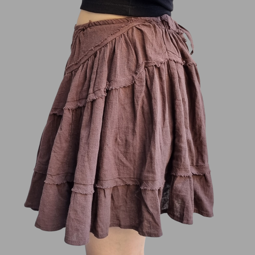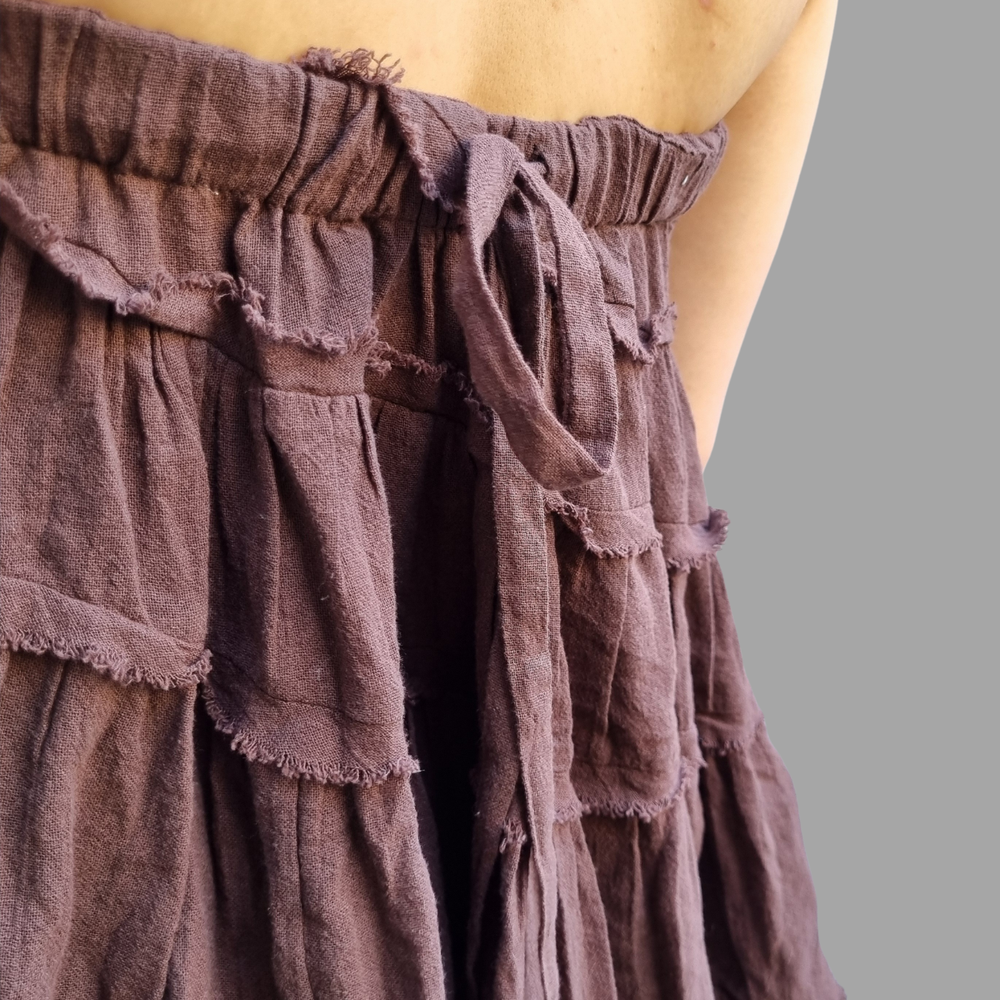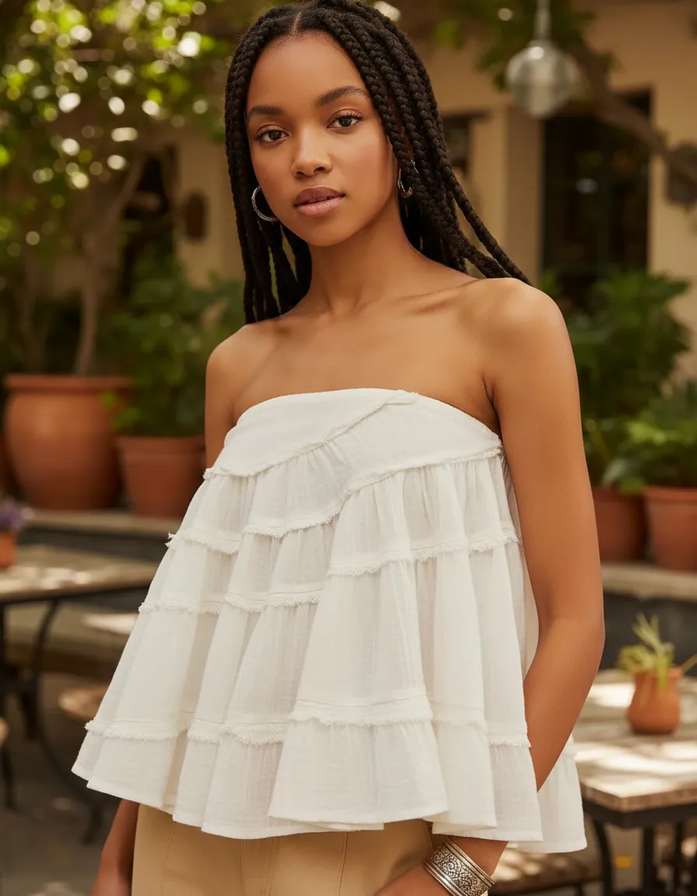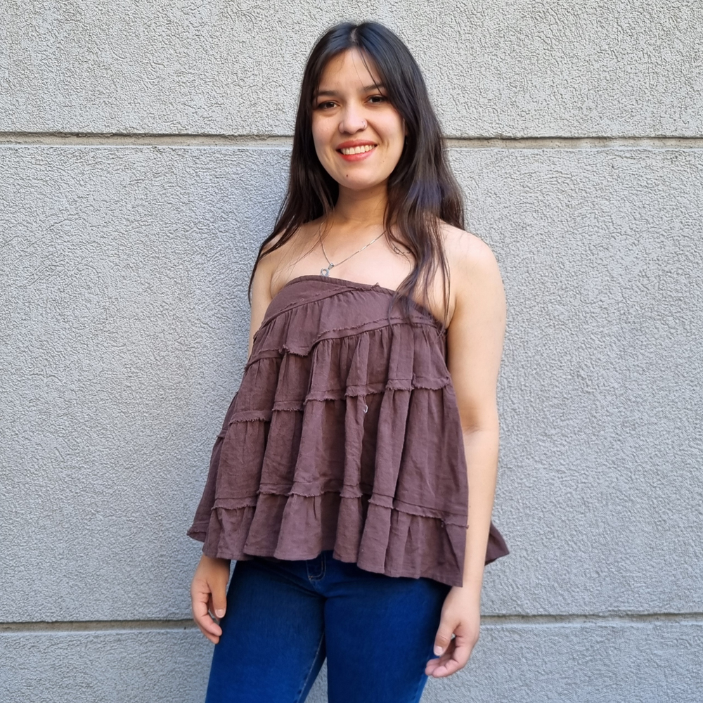 Este versátil modelo de Free People se puede usar como top sin tirantes o como falda ajustando el cordón. Presenta costuras expuestas y volantes escalonados.