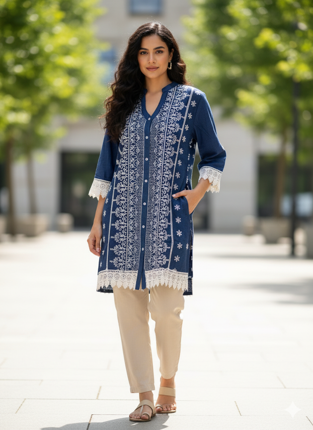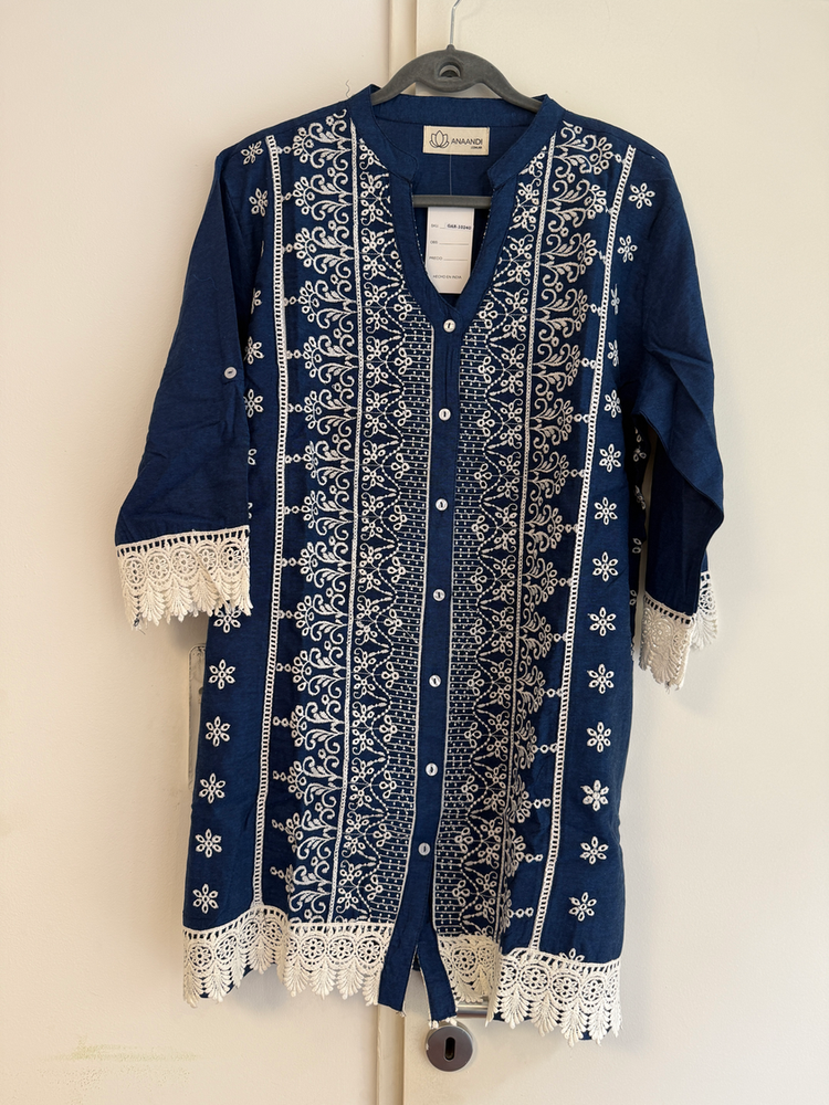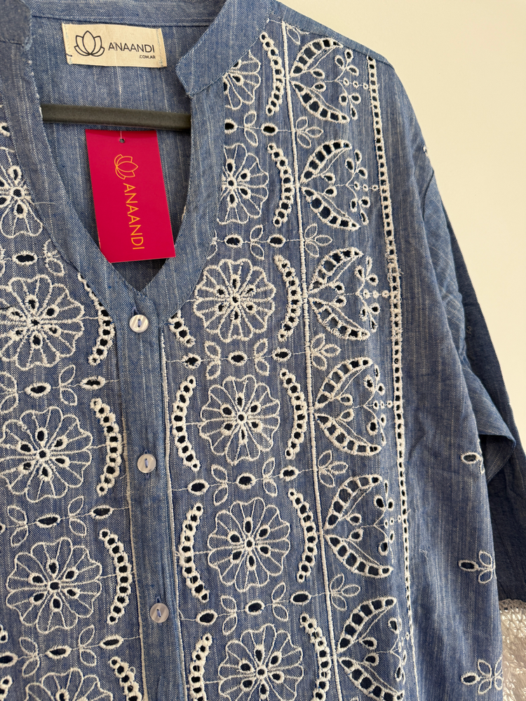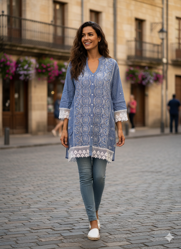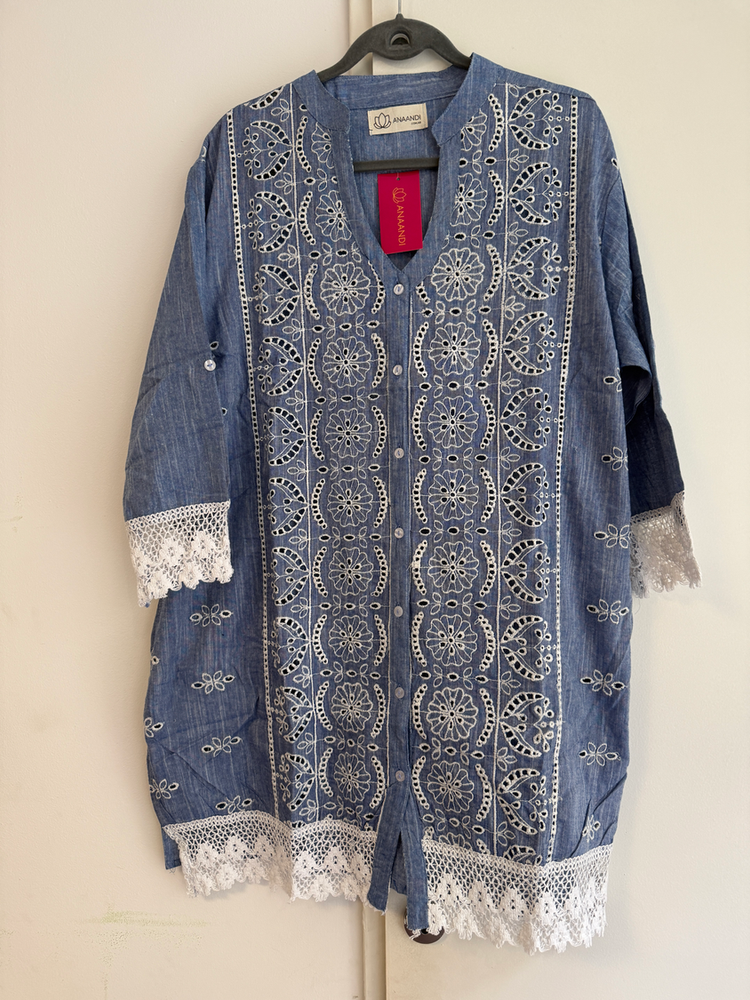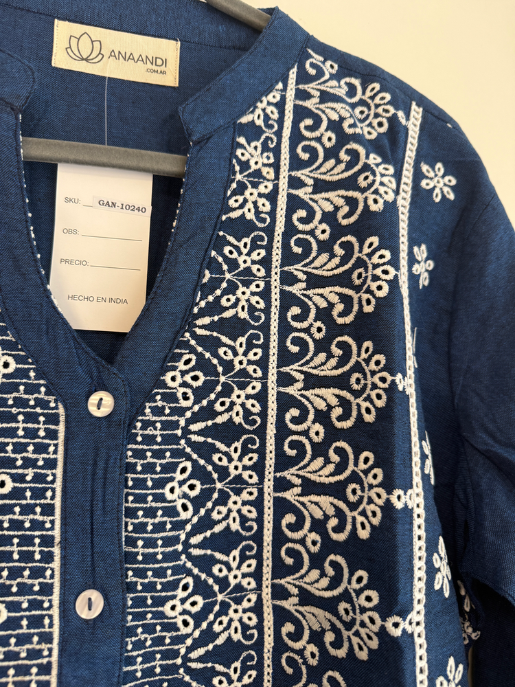 TUNICA CAMISOLA ABOTONADA BORDADA MANGA 3/4 MARCA: ANAANDI ORIGEN: Inida COMPOSICIÓN: SIMIL JEAN