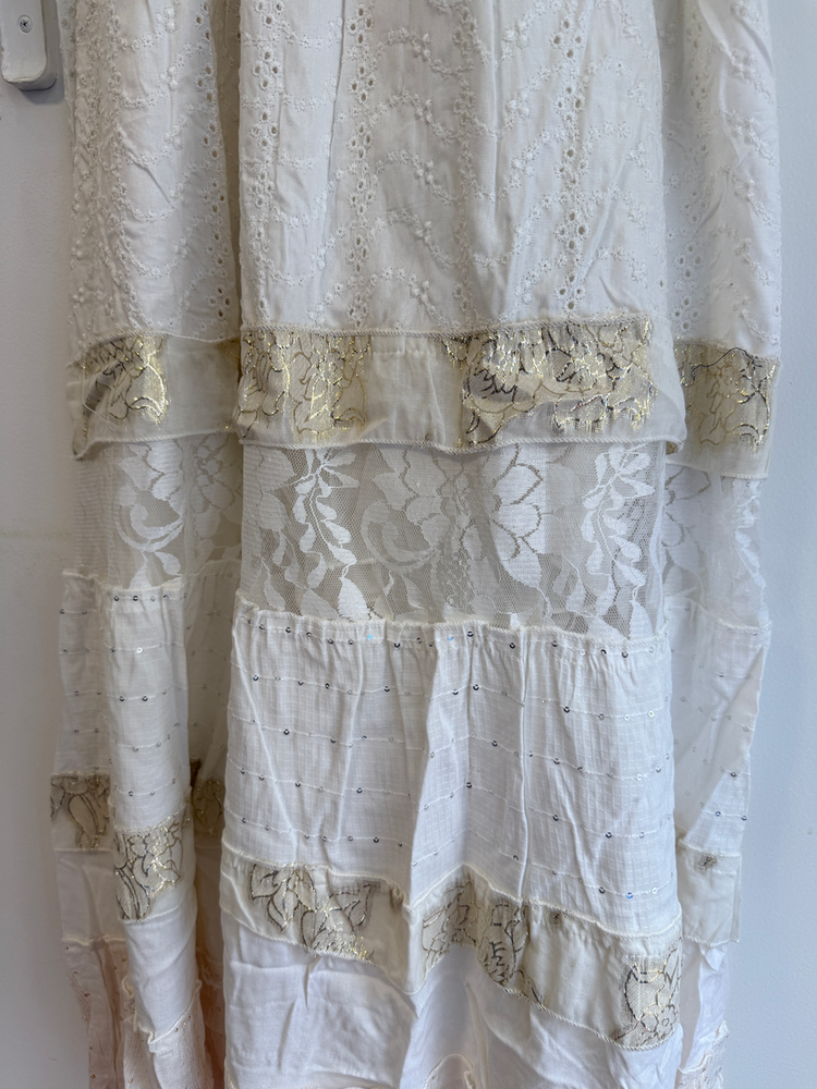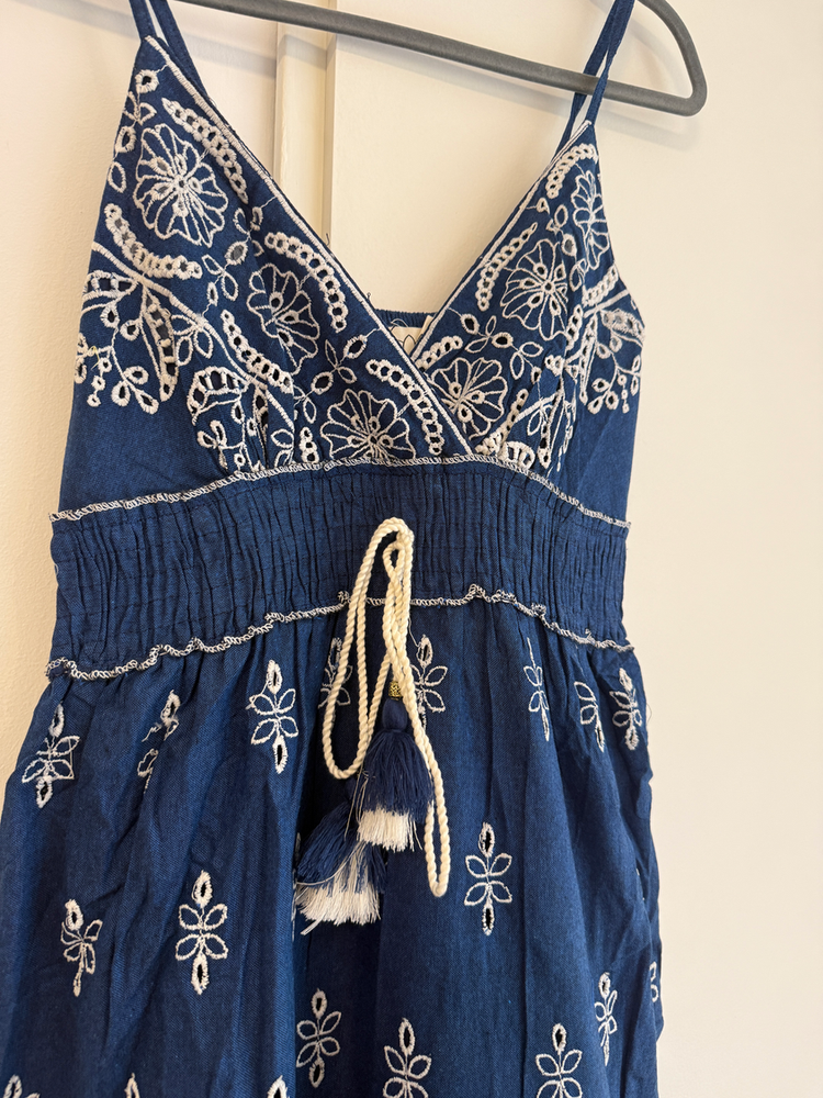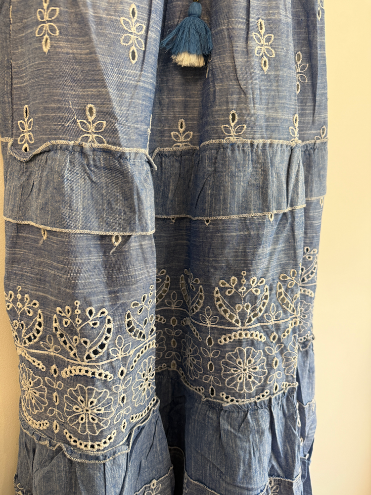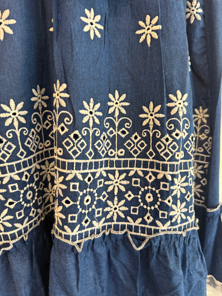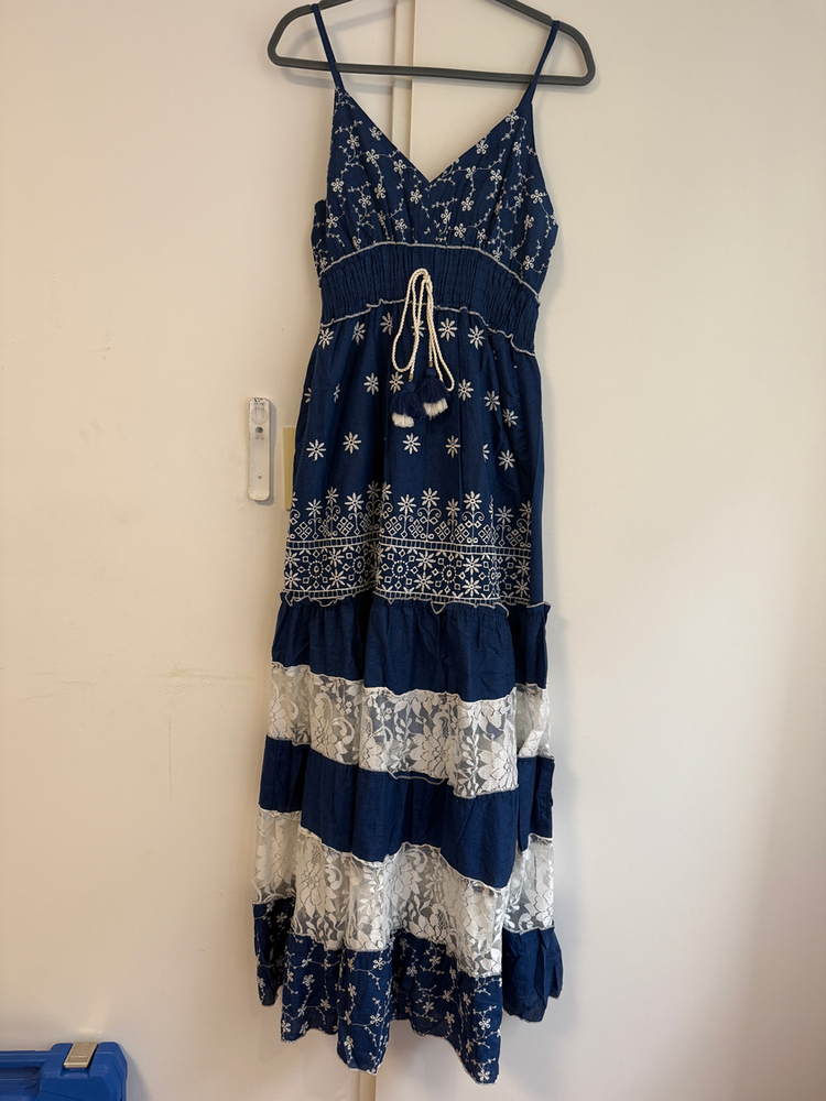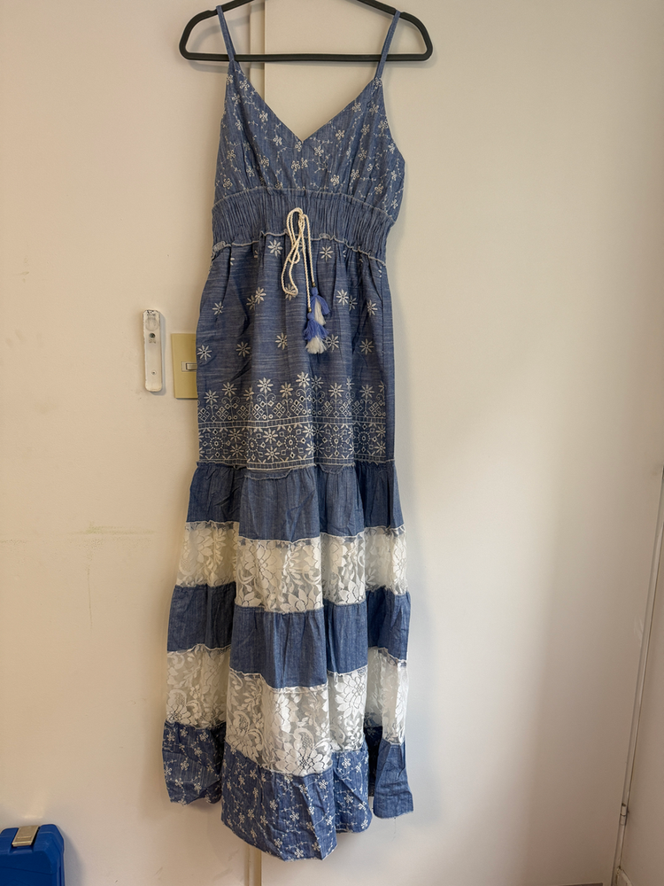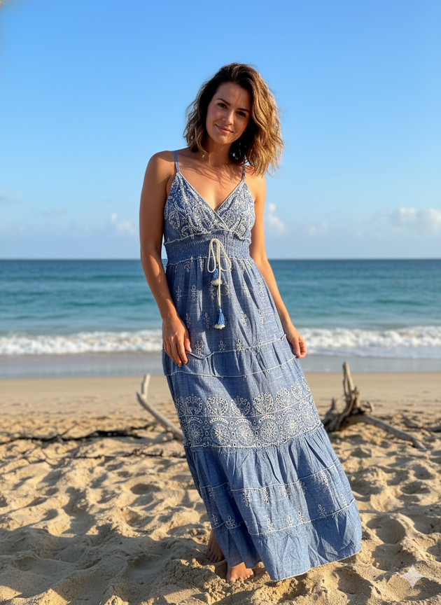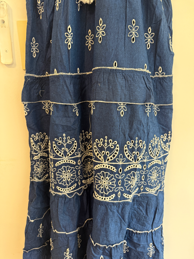 VESTIDO LARGO TIRITAS BORDADO FLORES EN HILO. DETALLE ENCAJE Y CON FORRO INTERNO. MARCA: ANAANDI ORIGEN: Inida COMPOSICIÓN: SIMIL JEAN
