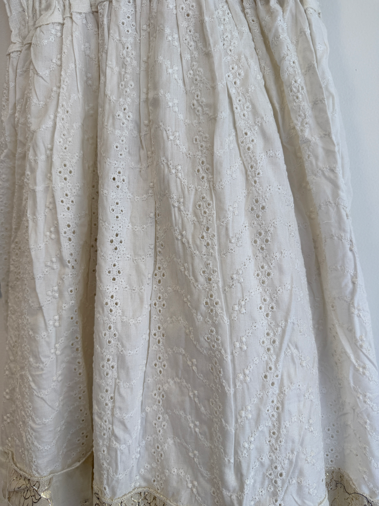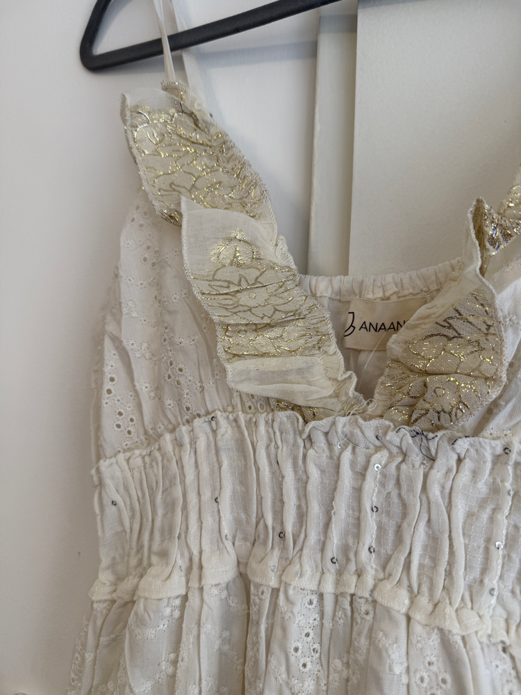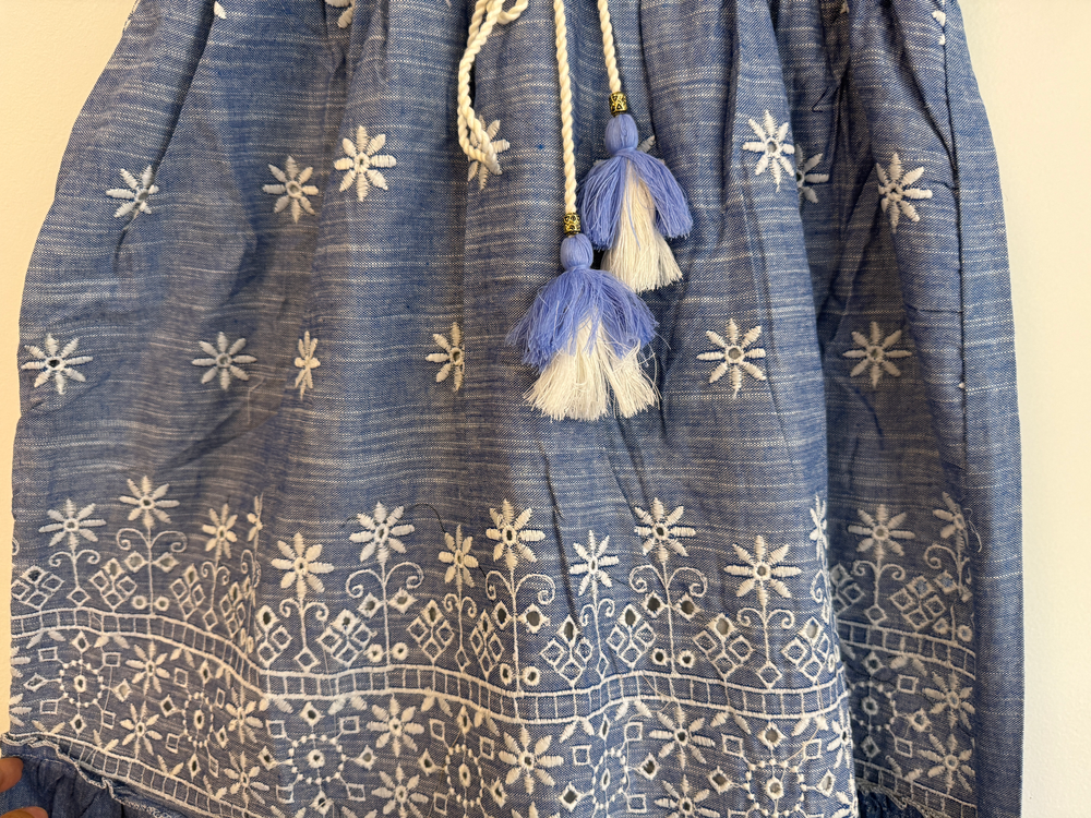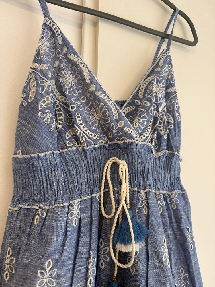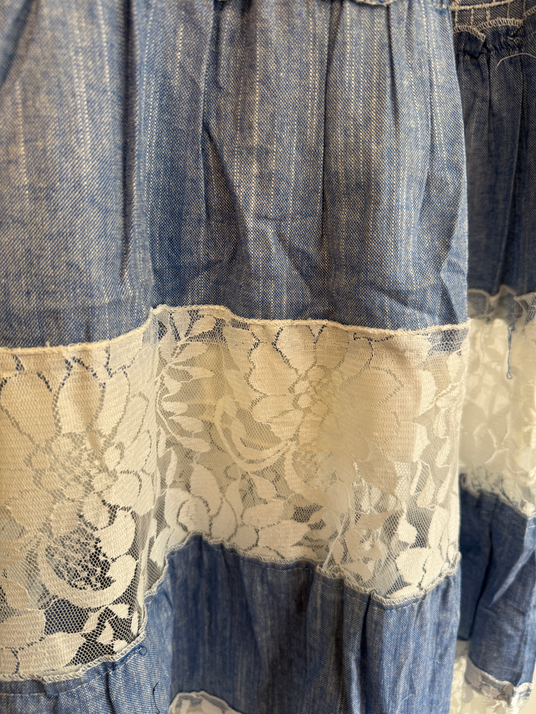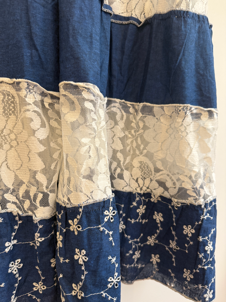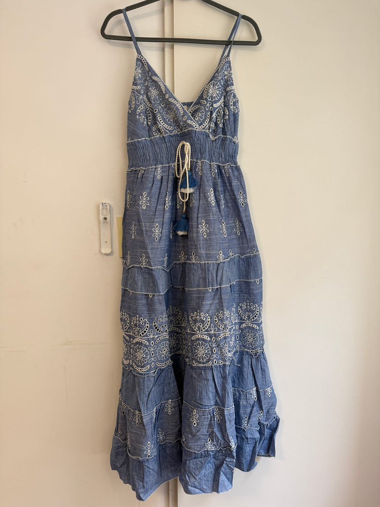 VESTIDO LARGO TIRITAS BORDADO FLORES EN HILO. DETALLE ENCAJE Y CON FORRO INTERNO. MARCA: ANAANDI ORIGEN: Inida COMPOSICIÓN: SIMIL JEAN
