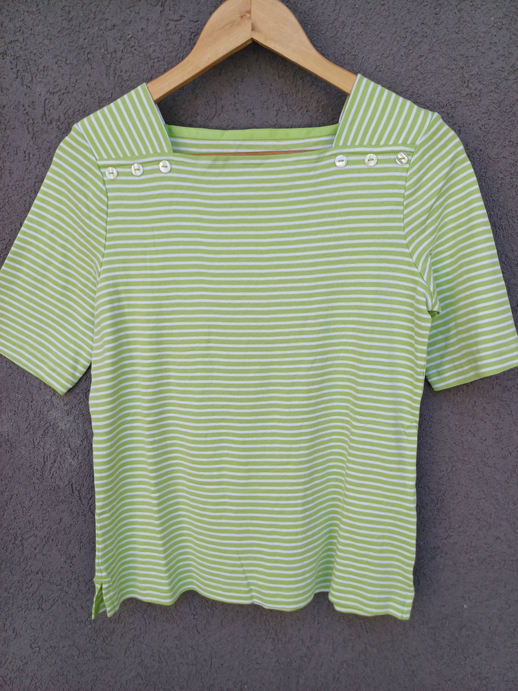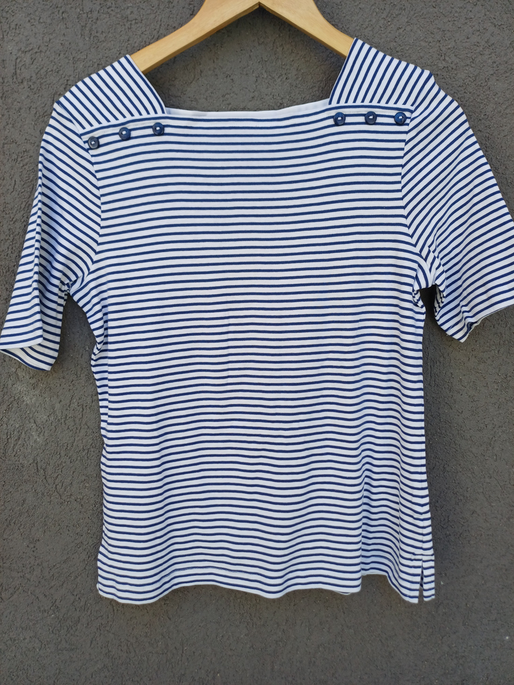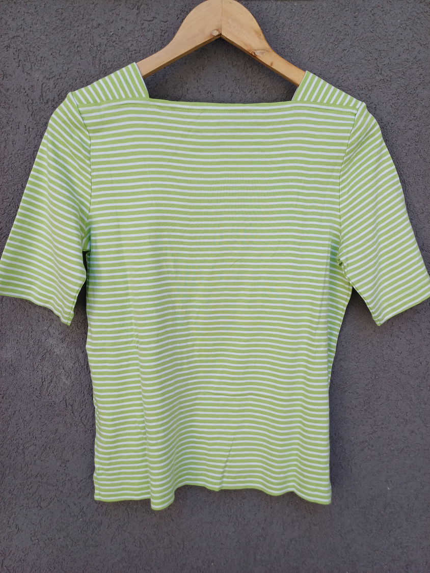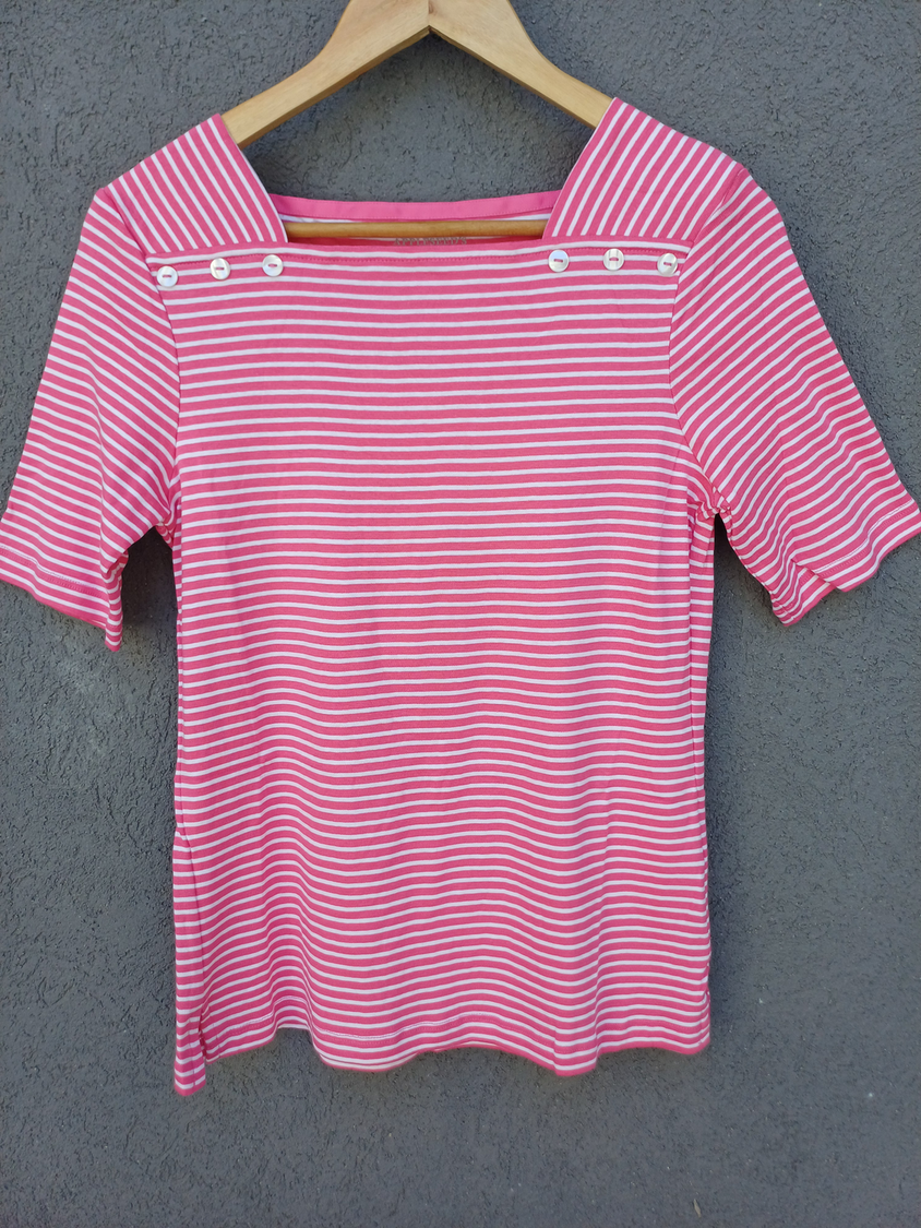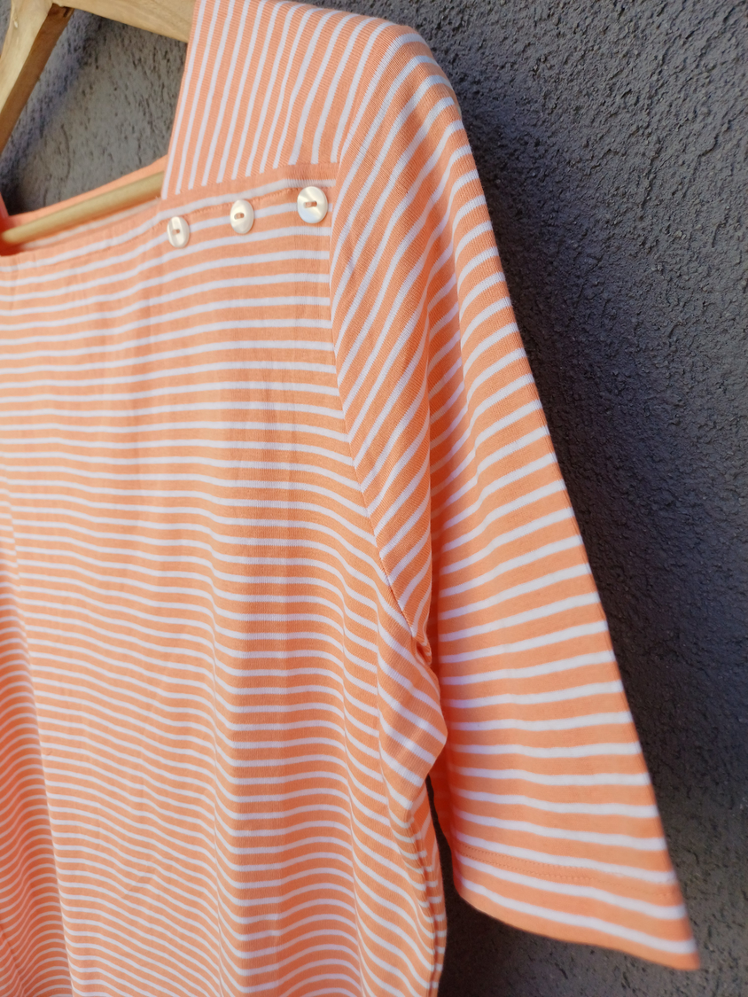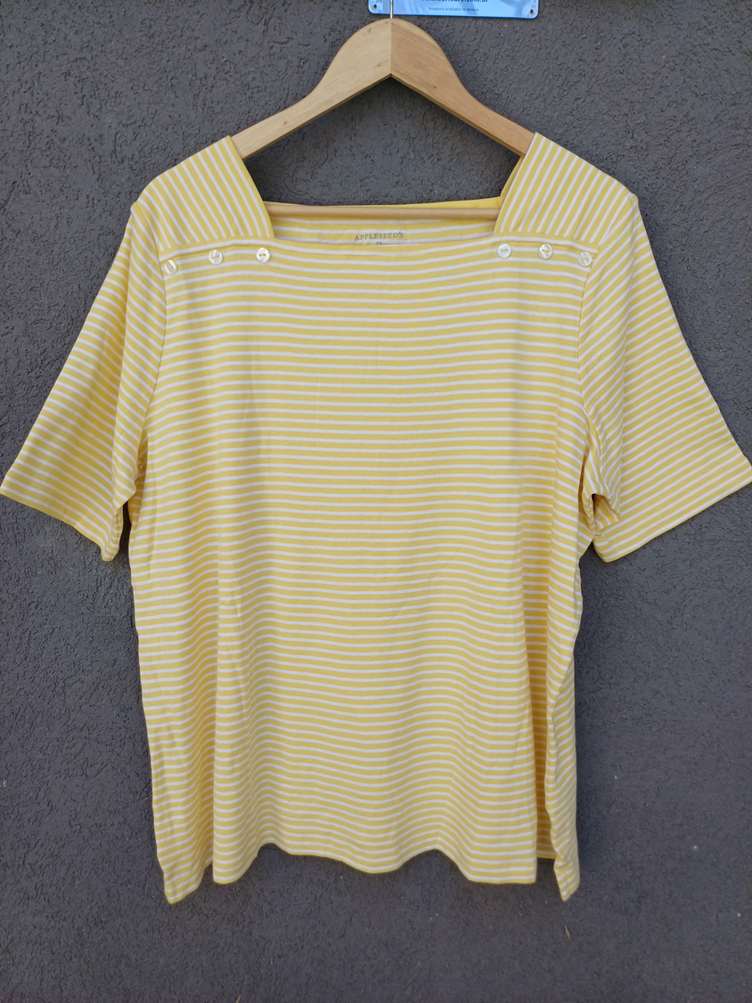 BLUSA RAYADA MANGA CORTA CUELLO CUADRADO CON DETALLE 3 BOTONES MARCA: APPLESEED´S ORIGEN: India COMPOSICIÓN: Algodón 100%