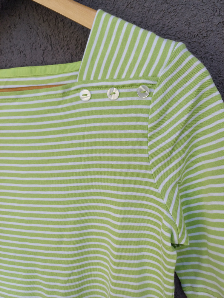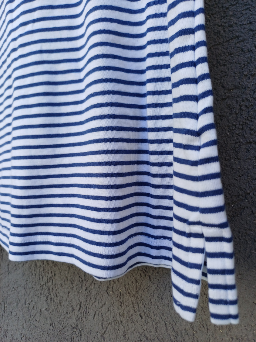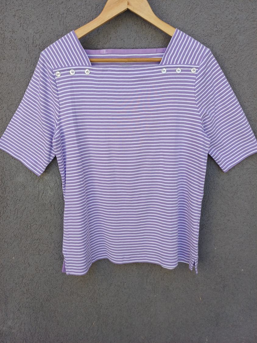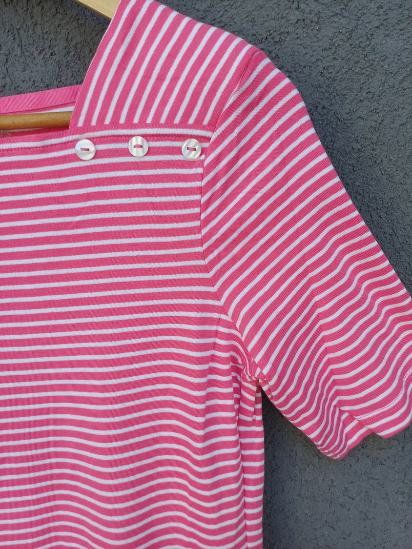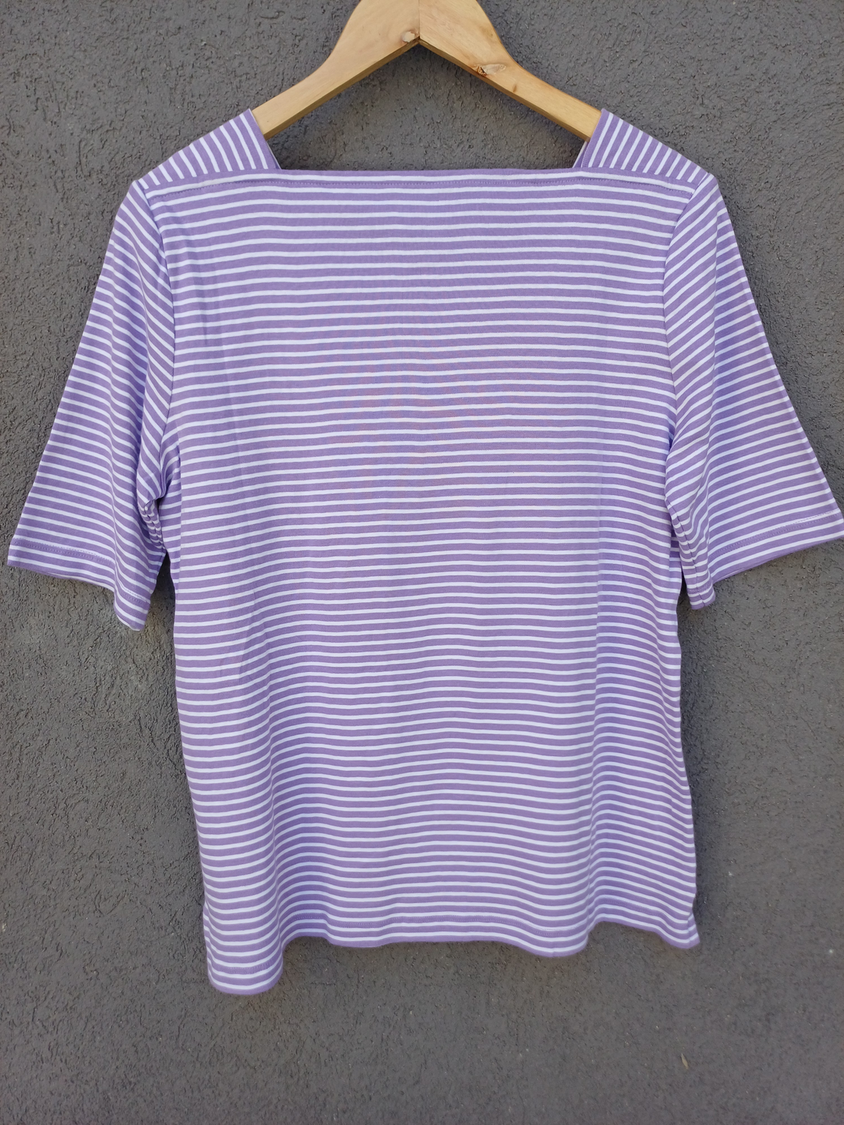 BLUSA RAYADA MANGA CORTA CUELLO CUADRADO CON DETALLE 3 BOTONES MARCA: APPLESEED´S ORIGEN: India COMPOSICIÓN: Algodón 100%