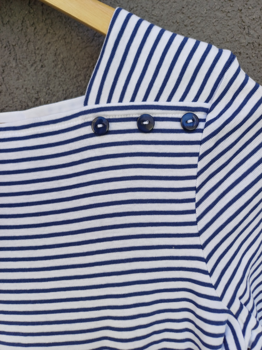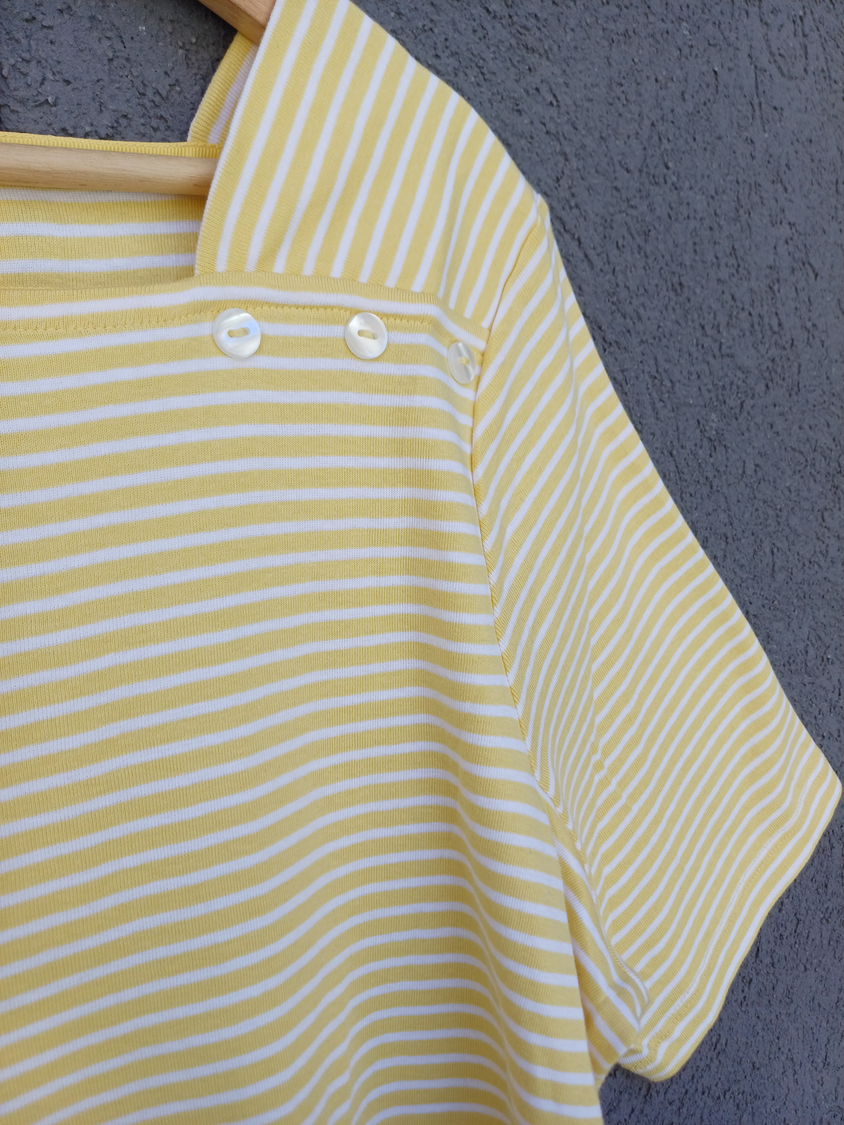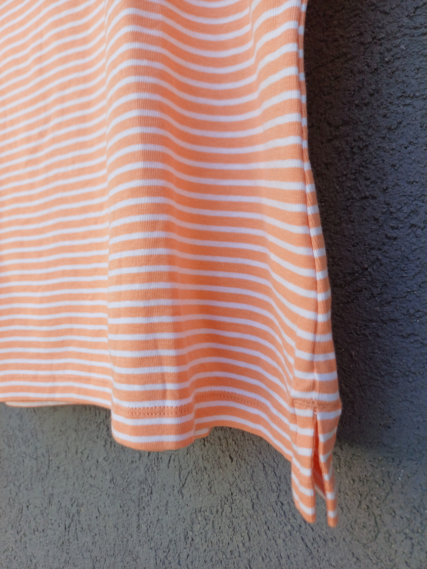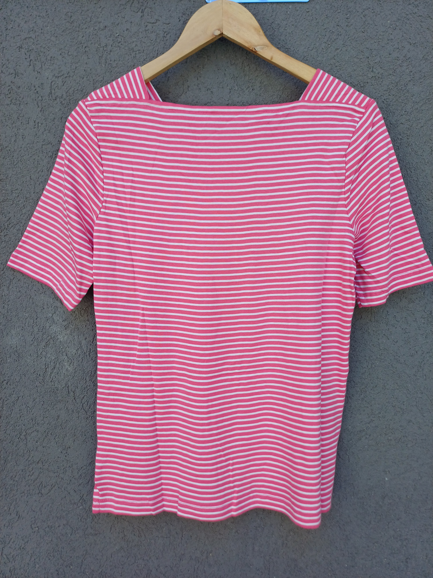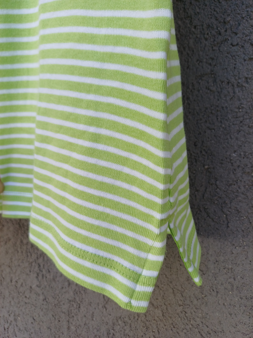 BLUSA RAYADA MANGA CORTA CUELLO CUADRADO CON DETALLE 3 BOTONES MARCA: APPLESEED´S ORIGEN: India COMPOSICIÓN: Algodón 100%