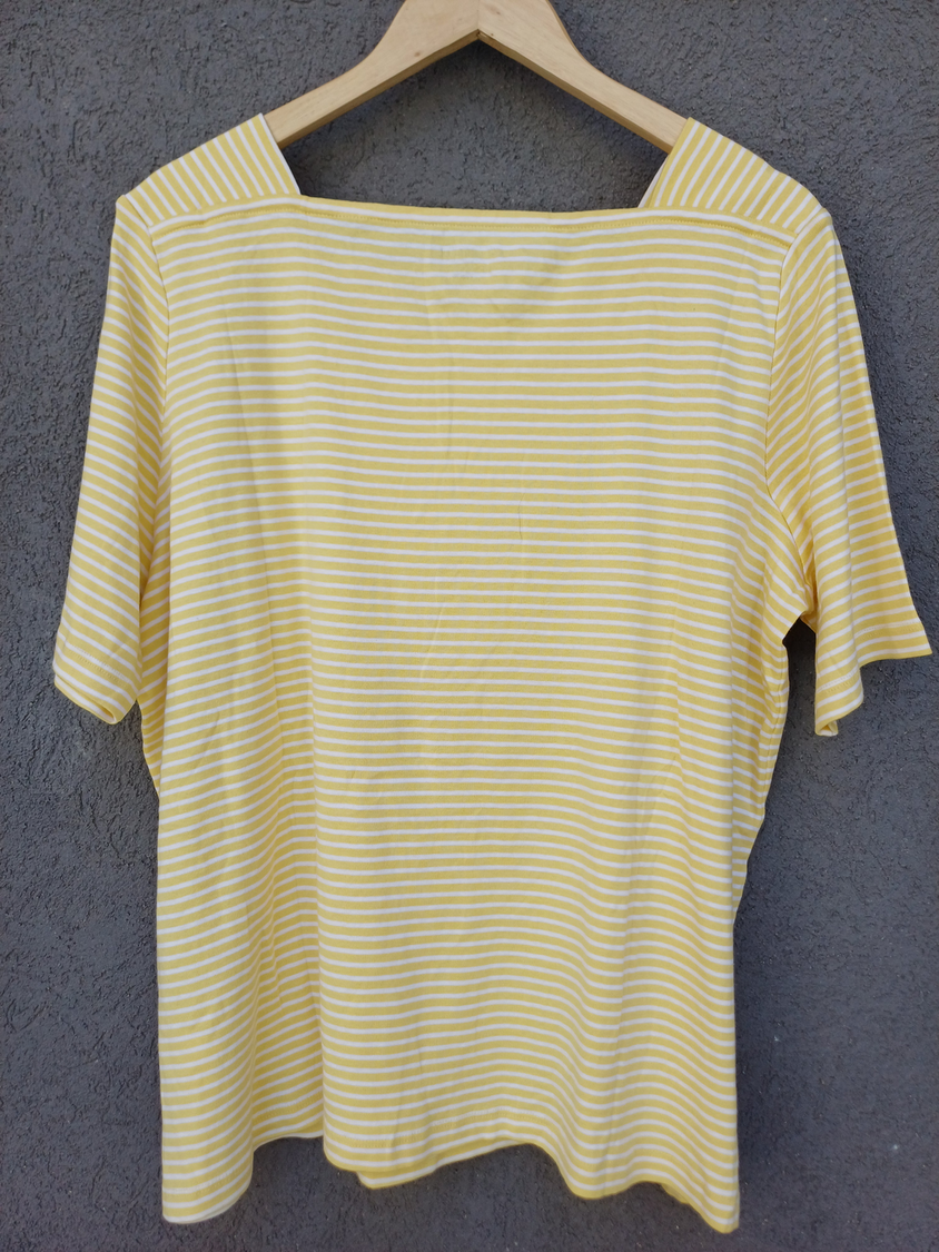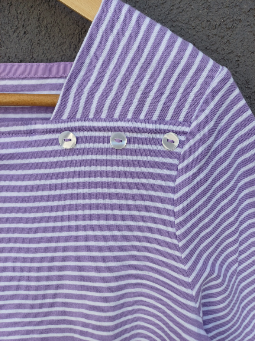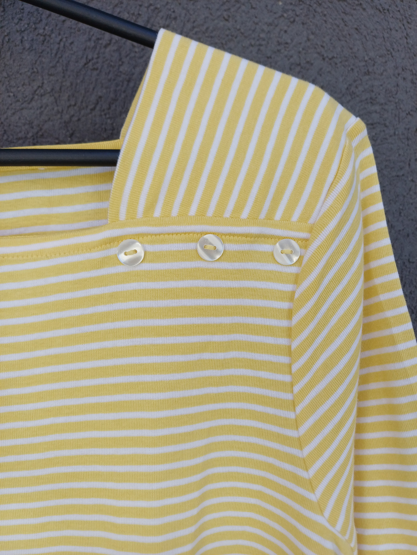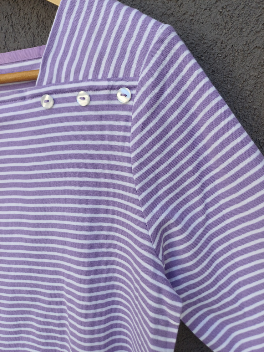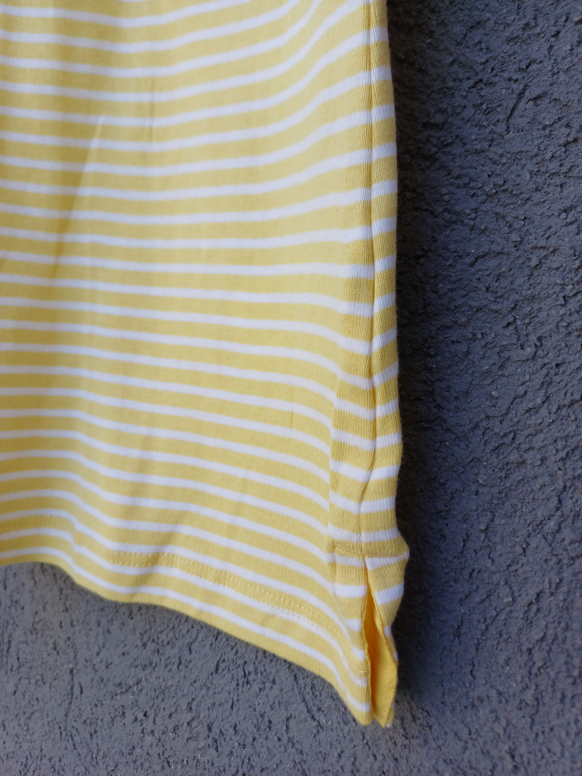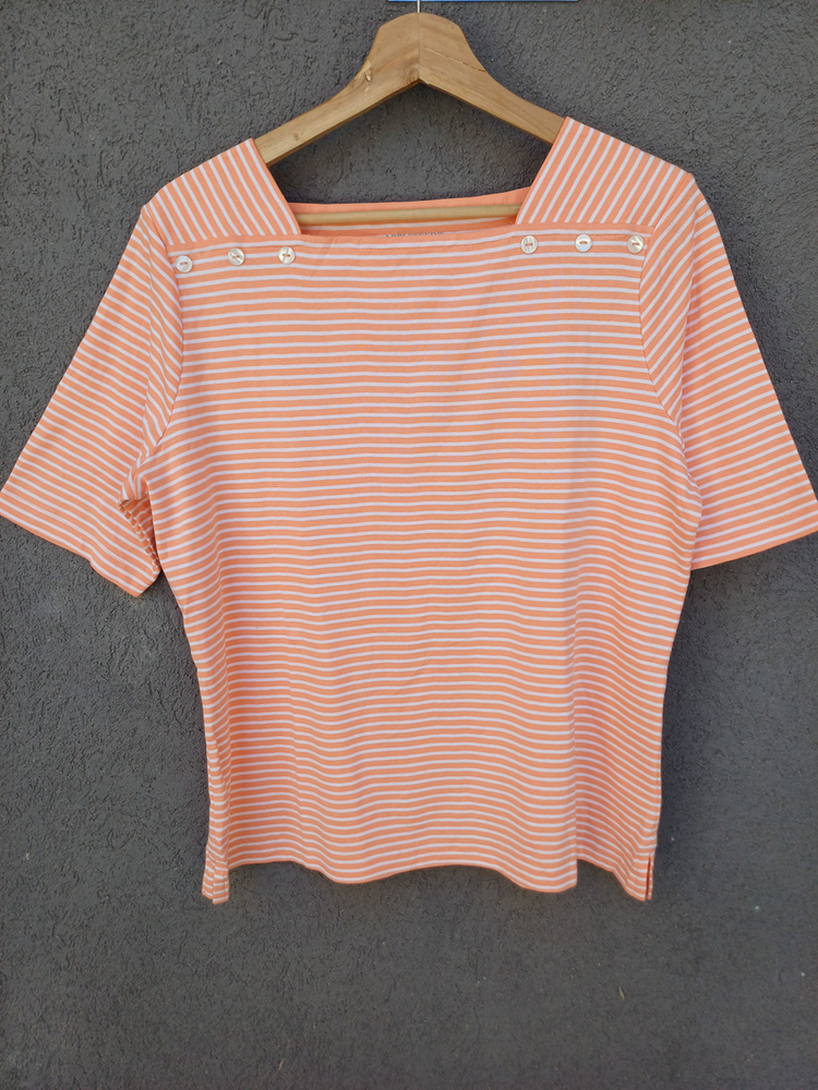 BLUSA RAYADA MANGA CORTA CUELLO CUADRADO CON DETALLE 3 BOTONES MARCA: APPLESEED´S ORIGEN: India COMPOSICIÓN: Algodón 100%