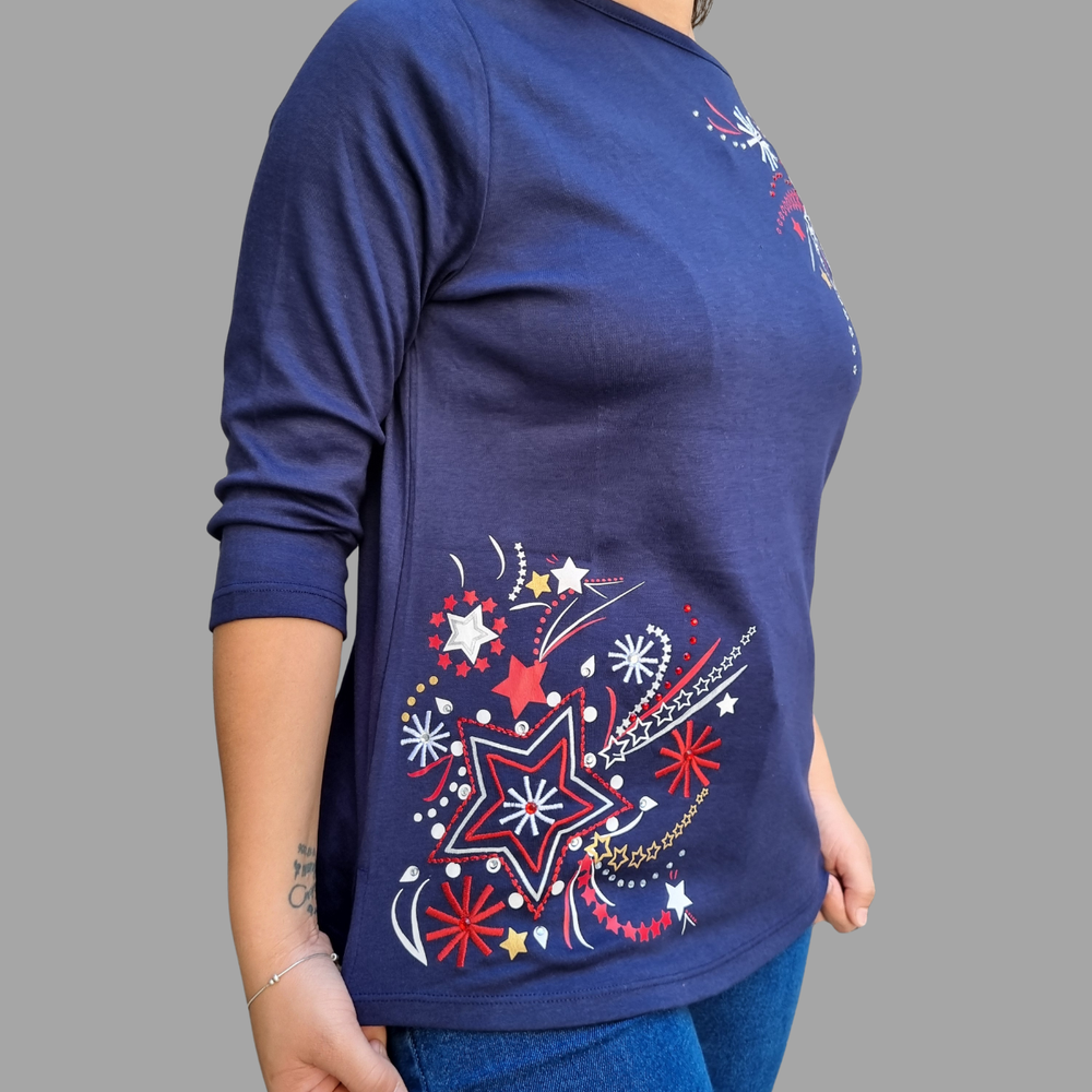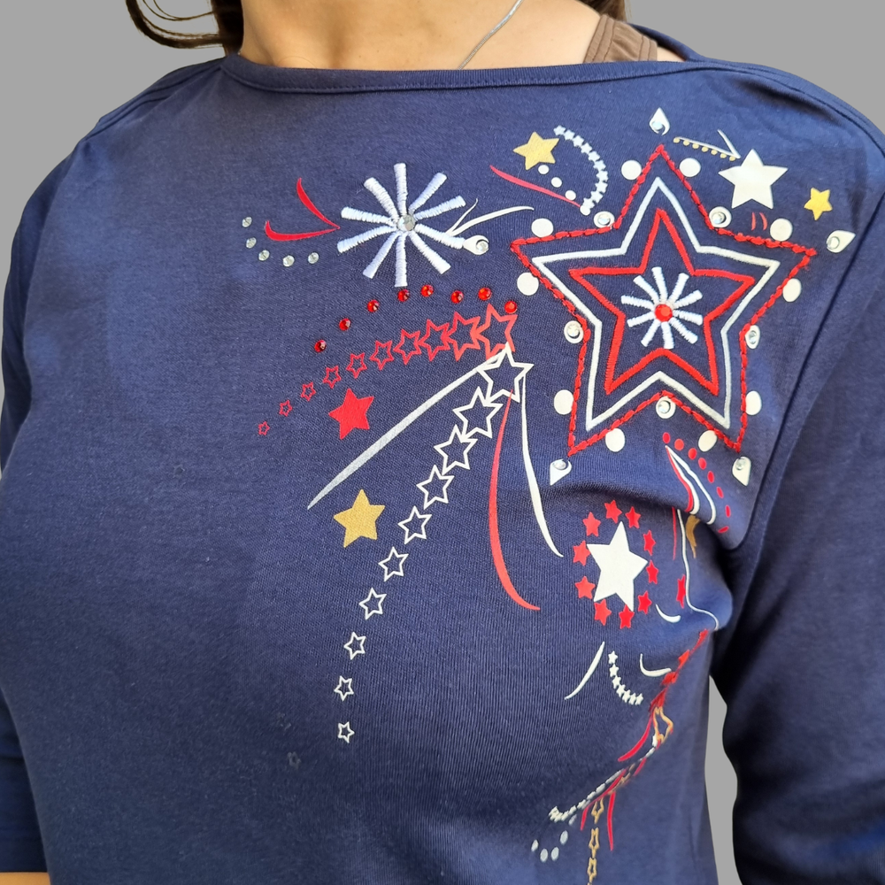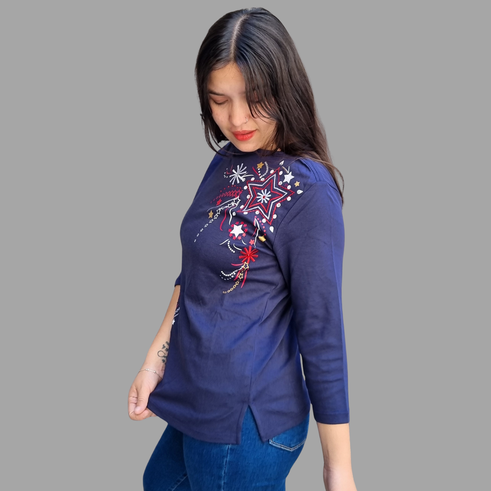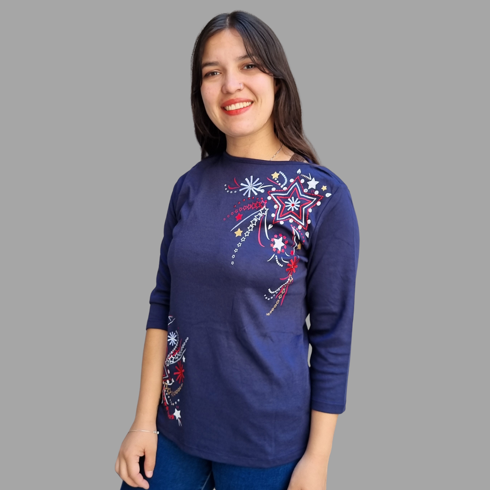 Blusa manga 3/4 bordado hilo detalle strass MARCA: Draper´s&Damon´s ORIGEN: India COMPOSICIÓN: Algodón 60% - Poliéster 40%