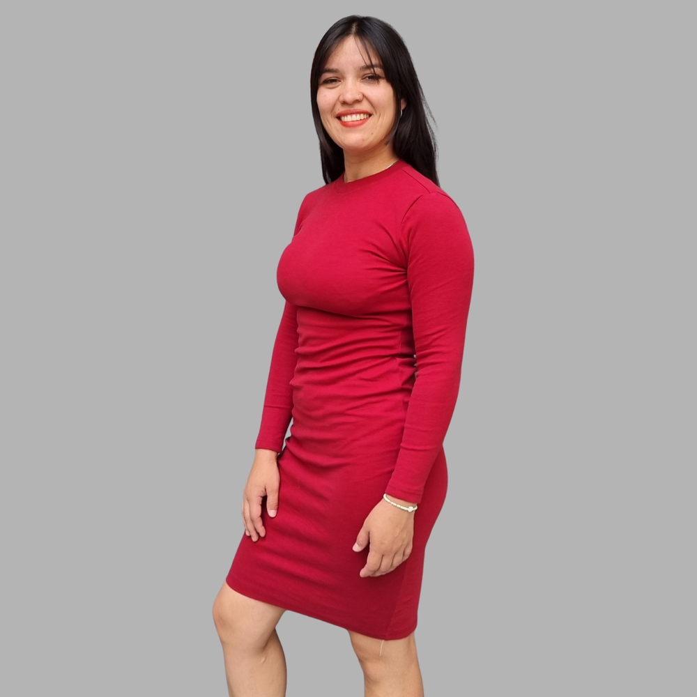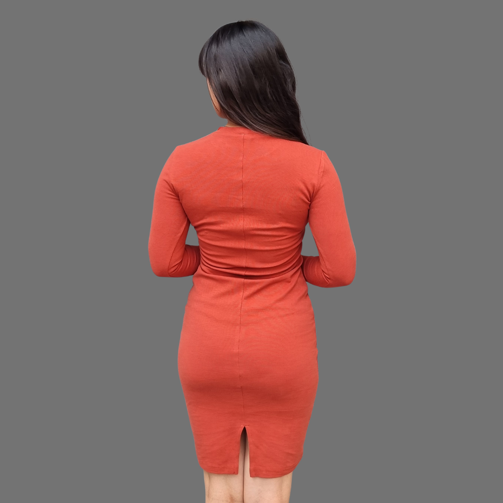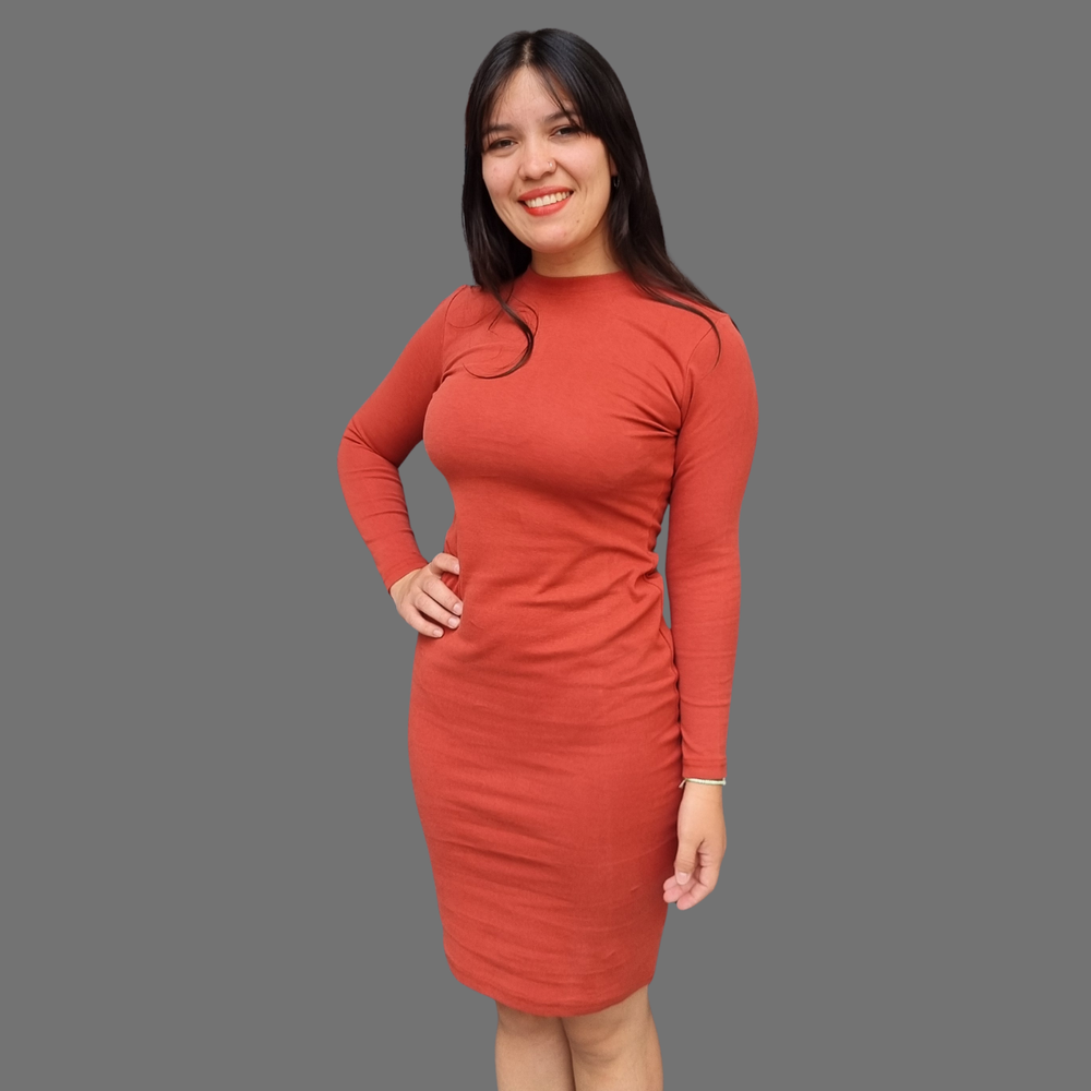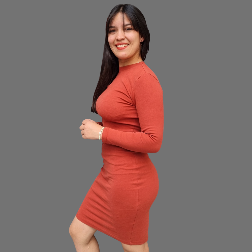VESTIDO LARGO MEDIO MANGA LARGA CUELLO REDONDO TAJO EN LA PARTE BAJA ATRAS