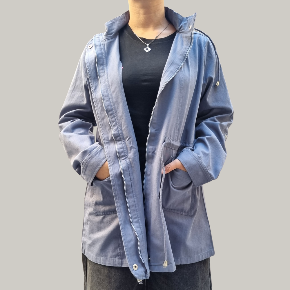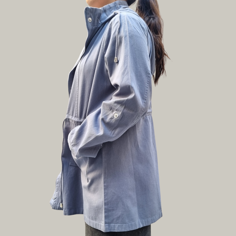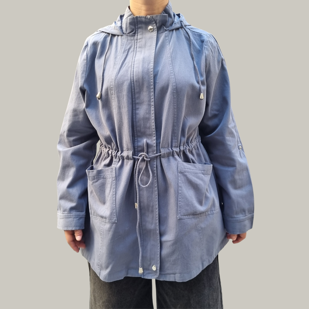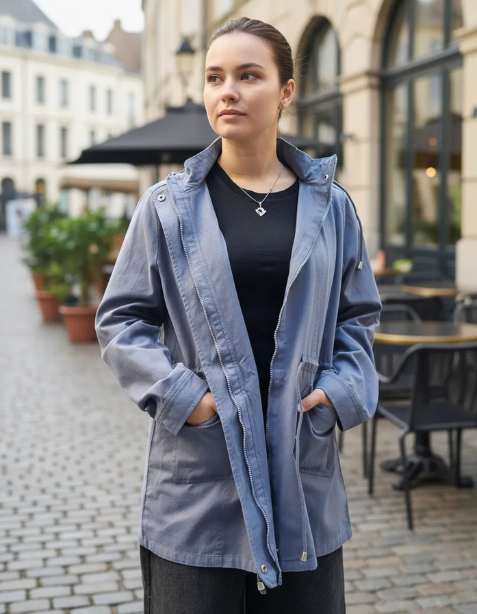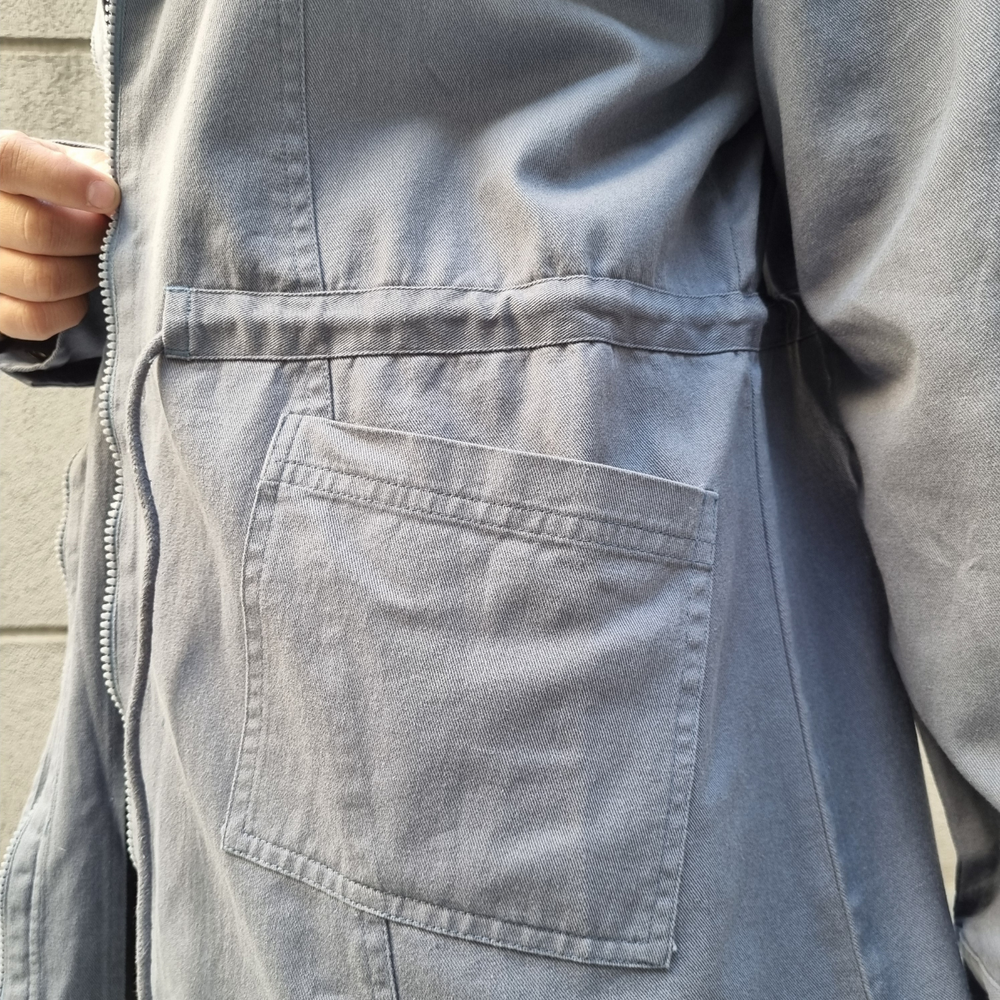 CAMPERA CHAQUETA GABARDINA CON CAPUCHA, CORDÓN, CIERRE Y 2 BOLSILLOS