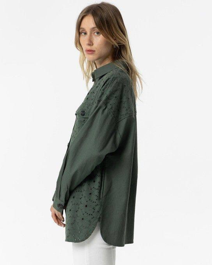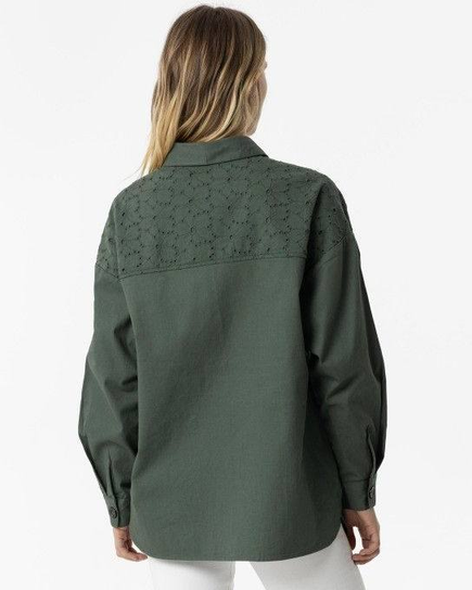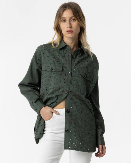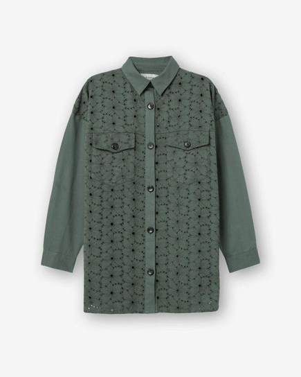DETALLES DESTACADOS - Broderie frontal con detalles florales - Color verde militar, tendencia de temporada - Bolsillos delanteros con solapa y botón - Cierre frontal con botones a tono